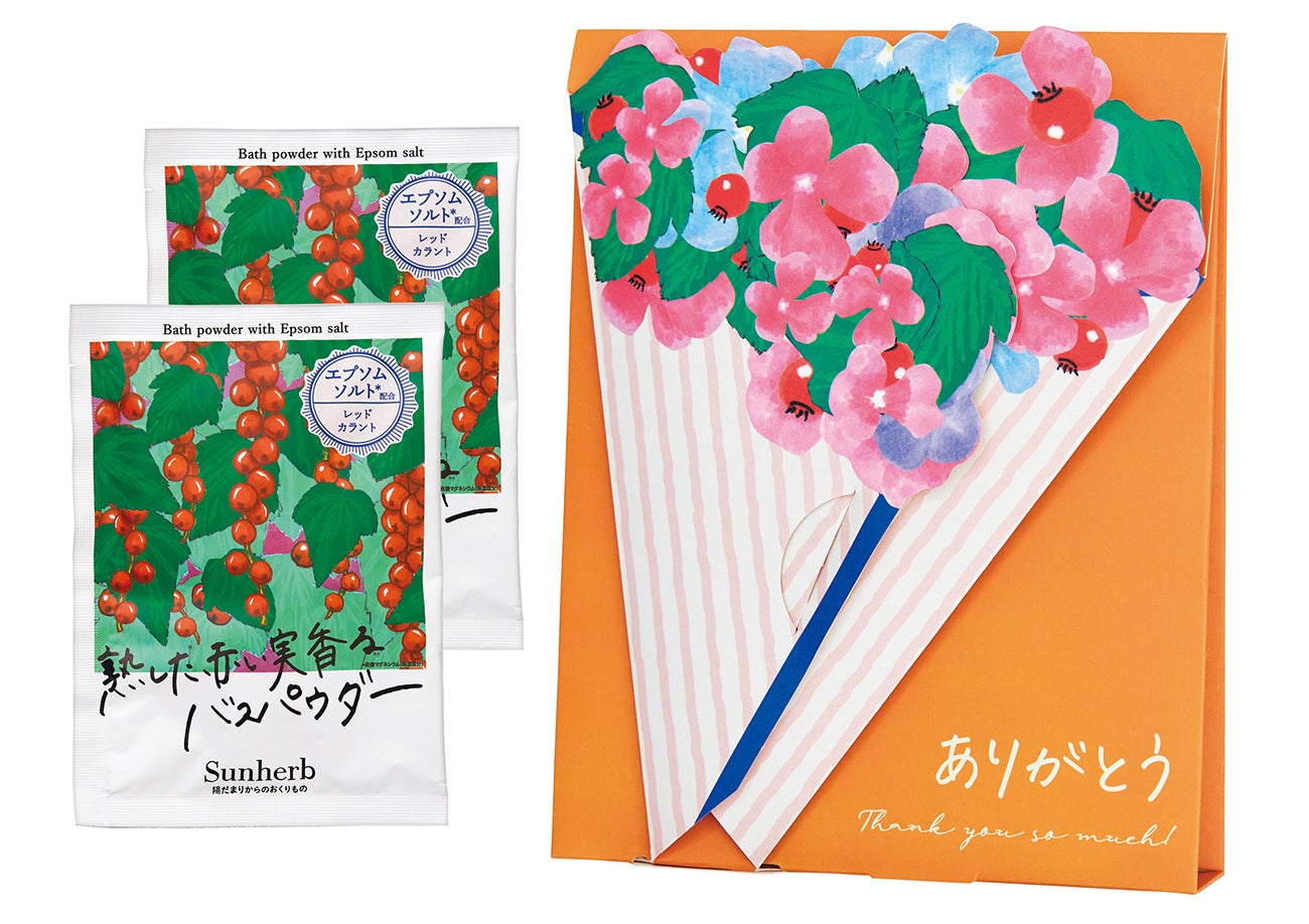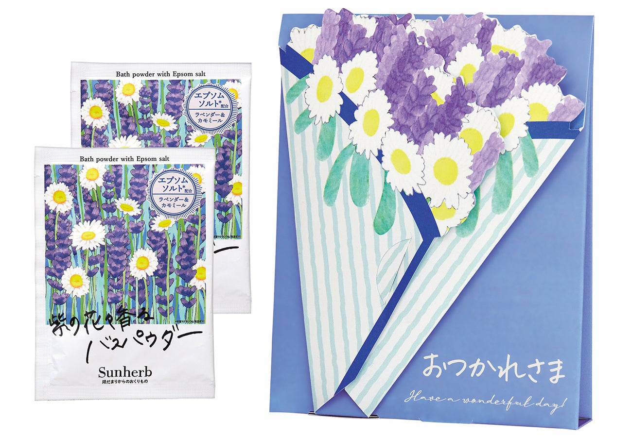 まるで花束のようなパッケージでバスパウダー2包を包んだメッセージプチギフト。