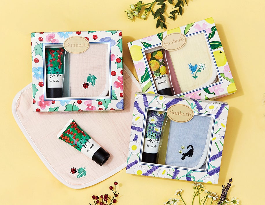 株式会社グローバルプロダクトプランニング(本社:東京都渋谷区南平台町)は、散歩中に出会う草花や果実の風景を閉じこめた『サンハーブ 陽だまりギフト』から、さまざまなシーンで贈りやすい花束のようなパッケージに入った「バスパウダーセット」と、ふんわりやわらかいマシュマロハンカチとくつろぎハンドクリームがセットになった「ハンカチ&ハンドクリームセット」を2月24日に発売します。