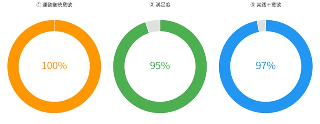 • 参加者の運動実践者74%、実践意欲含め97%により、教室外での運動継続が実現