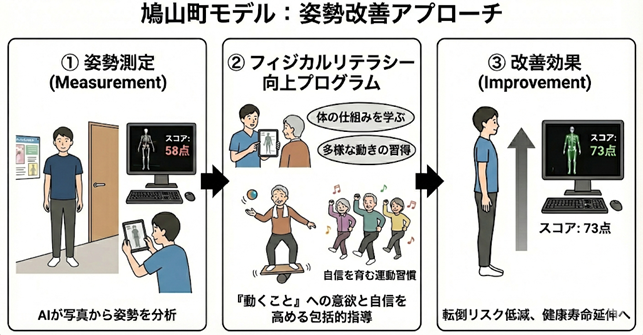 AI姿勢診断により、参加者本人が「自分の姿勢の変化」を数値とビジュアルで確認できるため、改善の実感と継続意欲の向上につながりました。これはフィジカルリテラシーの「心理的領域」と「認知的領域」の両方に働きかける仕組みでもあります。