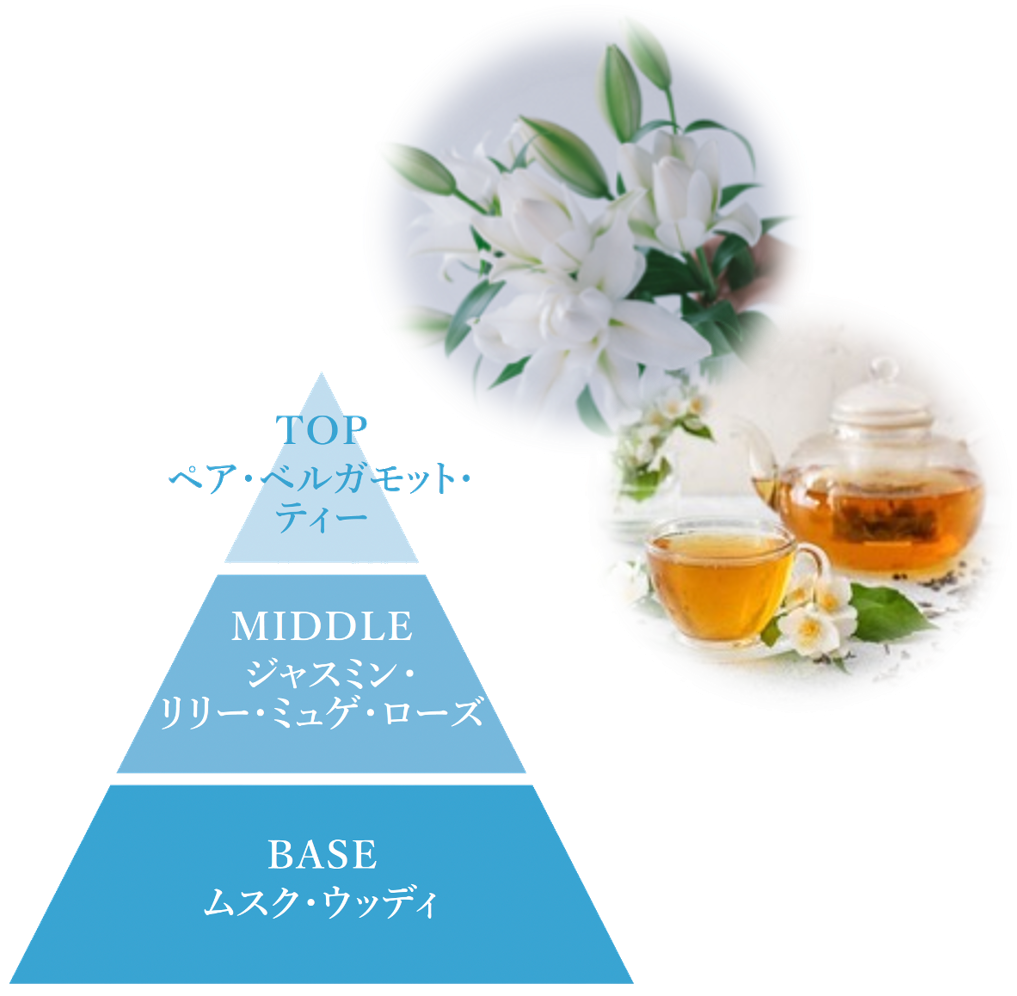 ホワイトリリーとティーの甘さが重なり合うナイトリリーアロマの香り。ムスクのやわらかな余韻に、大人びたジャスミンとミュゲが華やかさを添え、全体の香りを引き立てます。