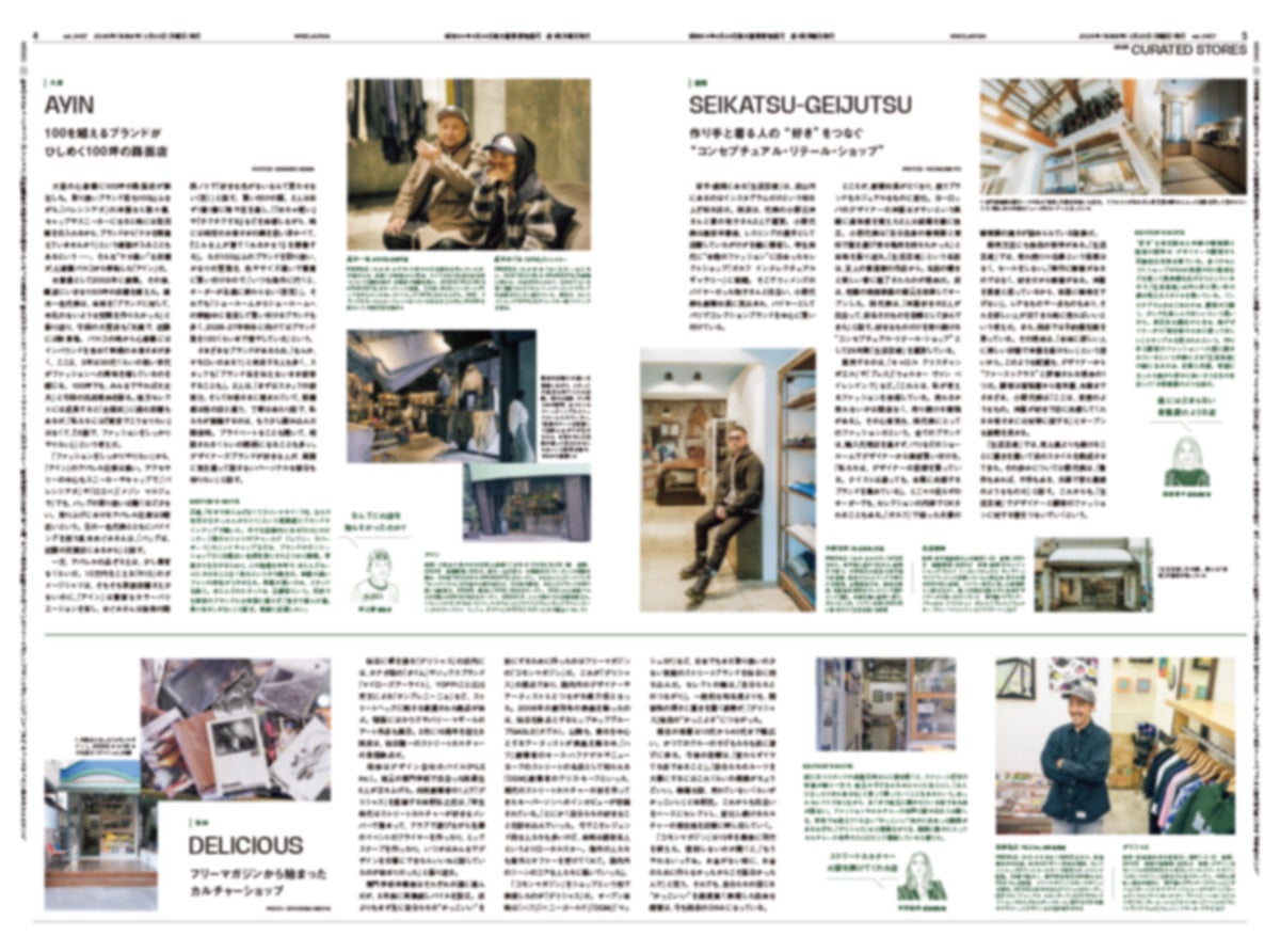特集では、店舗の役割が「セレクト:膨大な中から質の高いものを厳選する」から「キュレート:特定のテーマに沿って収集・編集し、新たな価値を加えて提案する」に変わりつつあるのではないか?と考え、それぞれの世界観やテーマ、収集・編集の方法なども伺っています。取り扱う100ブランド以上の洋服1着1着に袖を通して買い付けるか否かを決めたり、雑誌の発行を通して発信する審美眼で商品を選んだり、代理店などを極力介さずに作り手・持ち手の話を聞きながら吟味したり。こうした「セレクトショップ」改め「キュレイテッド・ストア」のさまざまな事例に迫りました。