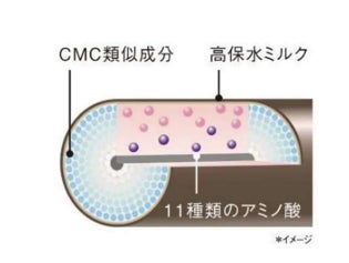 毛髪補修効果の高い CMC 類似成分※3、11 種のアミノ酸※4をブレンドした浸透美容液成分を高保水ミルク※5の中にとじこめた“美容液 in ミルク処方”を採用。美容液成分が髪の芯まですばやく浸透しながら、高保水ミルクが髪表面をコーティングし、髪の外側から内側まで同時にケアします。