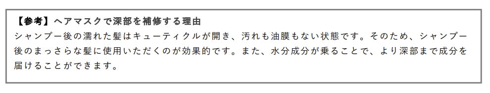 髪の毛におけるまとまり・ツヤのなさの原因は、日々のダメージやカラー・パーマなどの施術、加齢などにより、脂質やタンパク質が流出し、髪の構造が乱れてしまうことが起因しています。美髪を取り戻すためには、脂質とタンパク質を補充し、本来の構造に着目した根本的なアプローチが必要です。『エッセンスイン ヘアマスク』は、美髪をサポートする厳選した美容液成分を配合。髪の内外にアプローチし、ダメージを補修します。