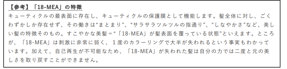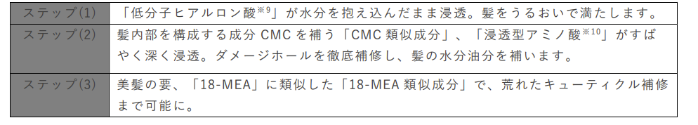 1.美髪成分をダイレクトに補修できる「18-MEA 類似成分※8」を配合