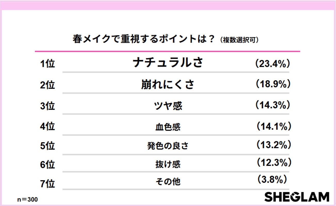 「春メイクで重視するポイントは?」という質問では、「ナチュラルさ(23.4%)」がトップに。次いで、気温が上がる季節を反映してか「崩れにくさ(18.9%)」が選ばれました。「ツヤ感」や「血色感」といった質感へのこだわりも上位にランクインし、「作り込みすぎない自然な仕上がりを、長時間キープしたい」という、実用性とトレンドの掛け合わせが2026年春の正解メイクと言えそうです。