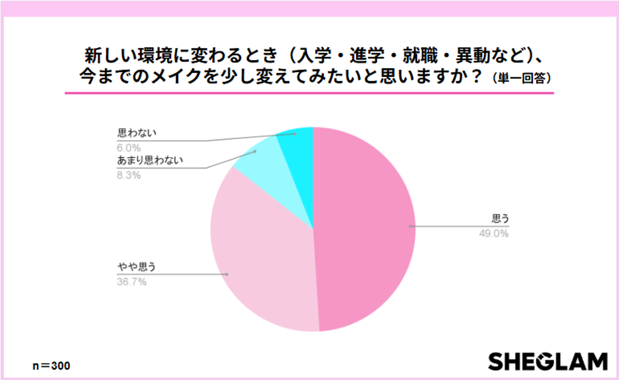 「新しい環境に変わるとき(入学・進学・就職・異動など)、今までのメイクを少し変えてみたいと思いますか?」という質問に対し、「思う(49.0%)」「やや思う(36.7%)」を合わせると、85.7%がメイクの変化を求めていることがわかりました。