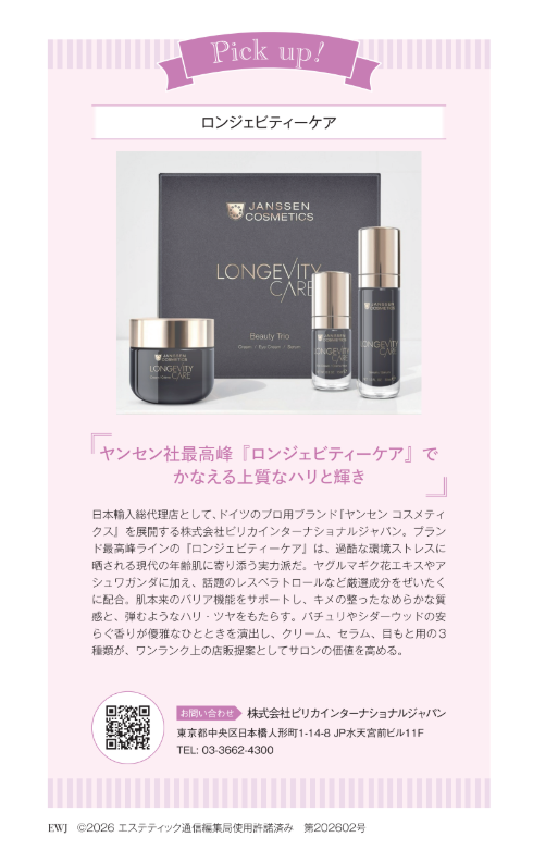 長年にわたりエステティック業界と真摯に向き合い、製品・サービスを通じて業界の発展に寄与してきた歩みとともに、次の時代を見据えたビジョンを提示する内容となっており、エステティック業界のさらなる飛躍を予感させるインタビュー特集として掲載されています。