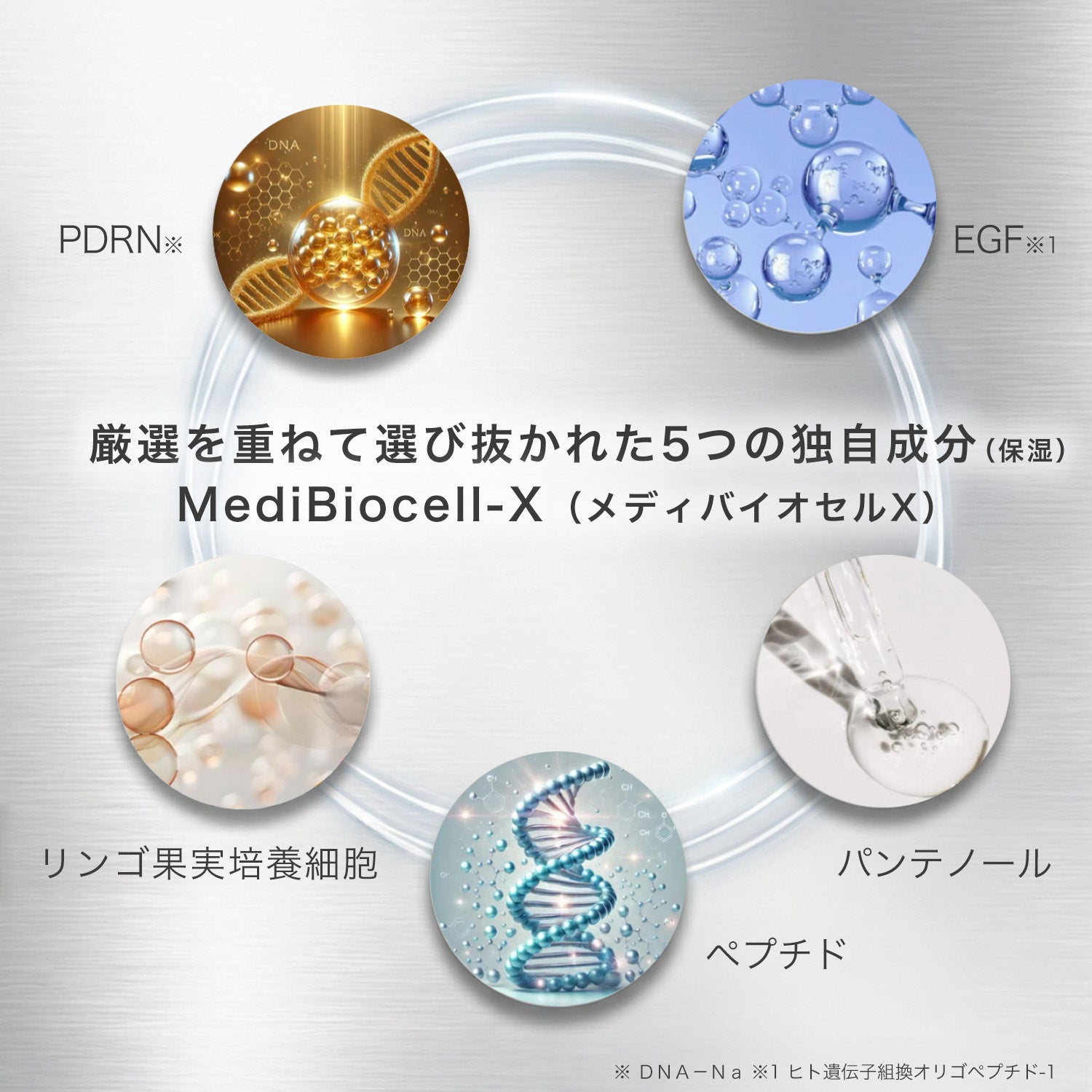 厳選した5種の美容成分(PDRN※2、EGF※3、リンゴ果実培養細胞エキス、ペプチド、パンテノール)を組み合わせた独自保湿成分「MediBiocell-X(メディバイオセルX)」