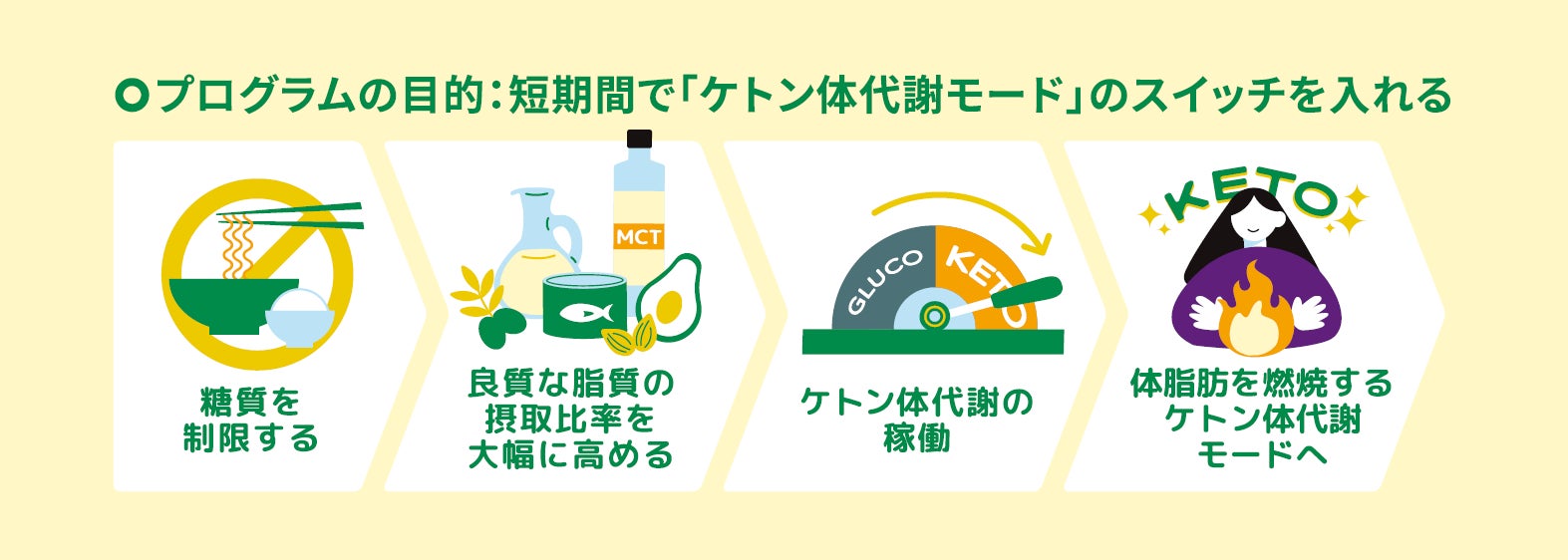 これにより、体の仕組みが脂肪を燃料にしやすい状態(ケトン体代謝)になり、無理なくスリムを目指せます。