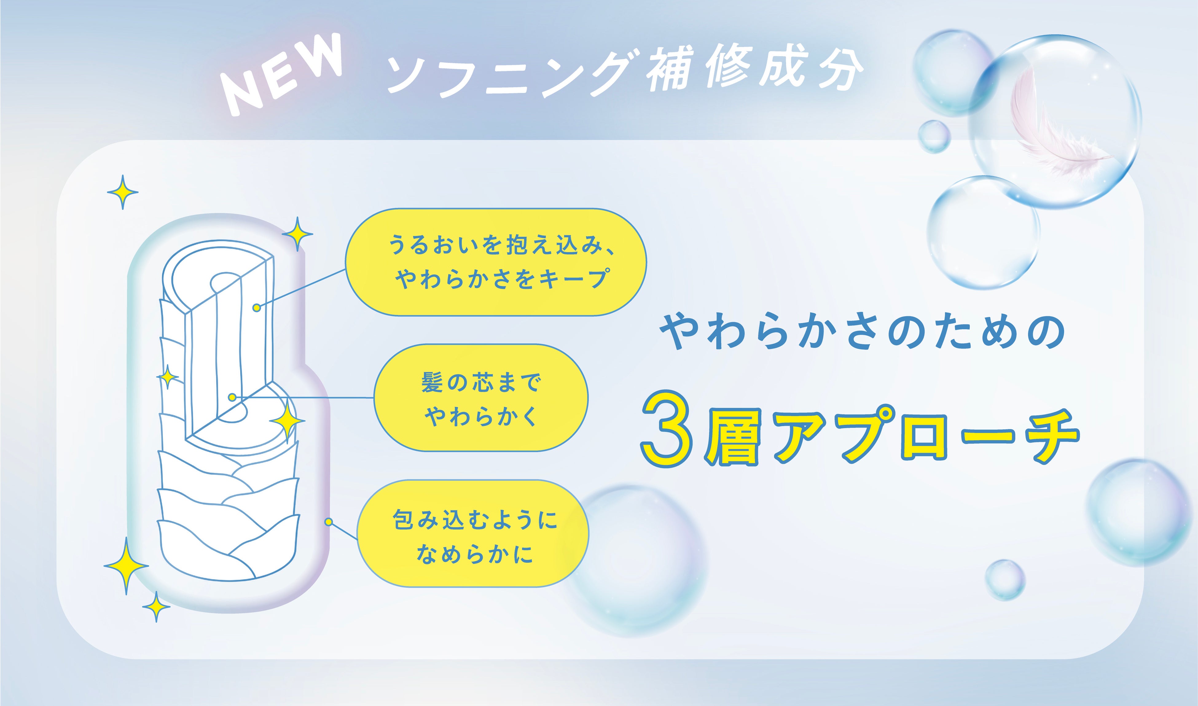 スキンケア発想成分(※1)が、髪と頭皮の水分・油分バランスを整え、毛先までうるおいのある髪に。さらに、髪の芯・内側・表面の3層へアプローチするソフニング補修成分(※2)を配合。熱や摩擦、カラーで硬くなった髪のダメージをケアし、内側までしなやかでやわらかな髪に導きます。