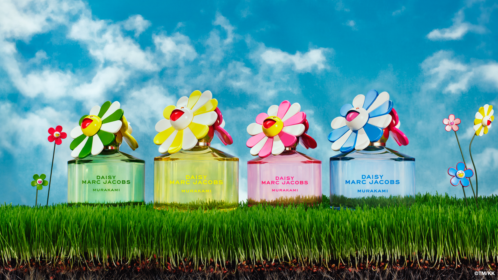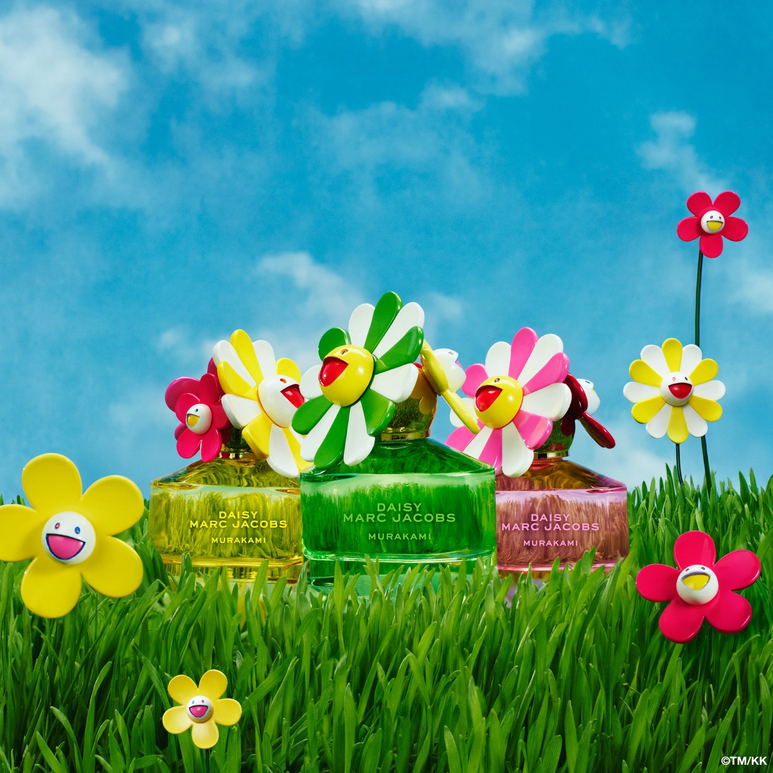 ニック・ニューボールドがコンセプトを手掛け、撮影を担当したデイジー ムラカミリミテッドエディションのキャンペーンは、村上 隆が描く、現実とファンタジーが融合した超自然的な世界へと誘います。緑豊かな芝生を背景に、鮮やかで幻想的な花々のボトルが、デイジーと村上 隆の遊び心を体現し、まるでデイジー・ムラカミの花が咲き誇る庭園に足を踏み入れたかのような、不思議な感覚を呼び起こします。