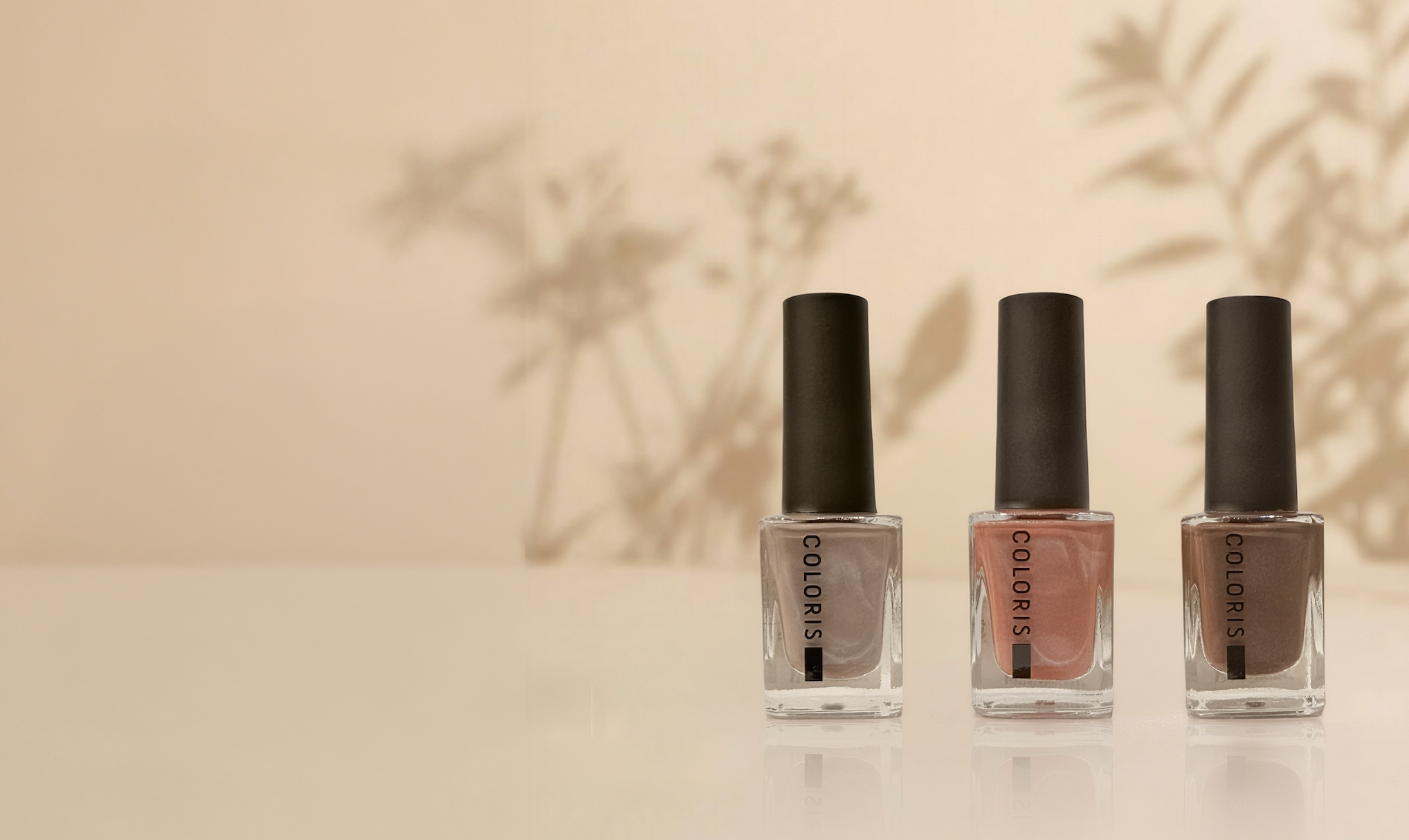 ネイルポリッシュのカラーは左から、パールグレージュ/ローズピンク/ダークベージュ