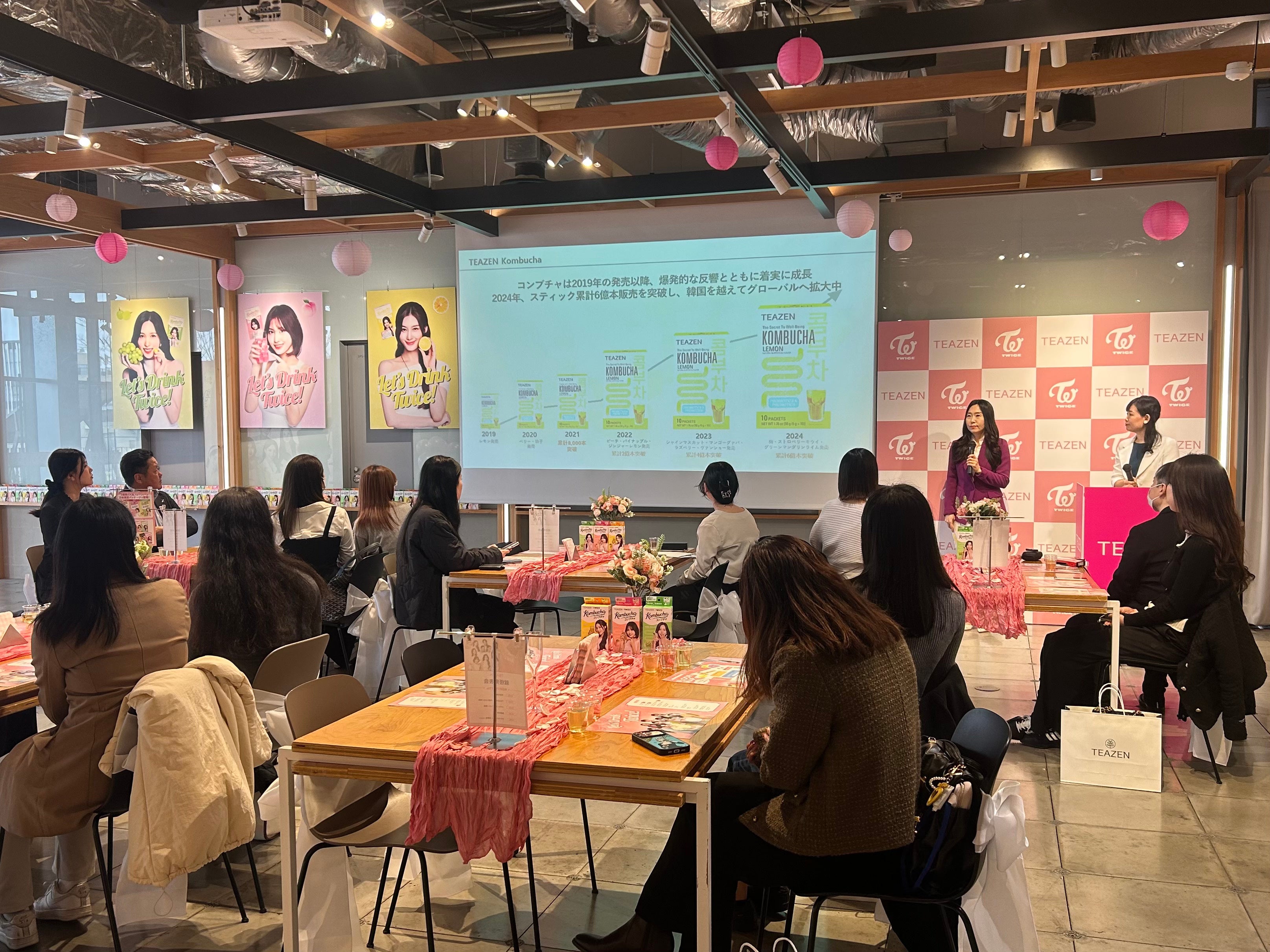 最後に日本での展開について、「本日の発表会を皮切りに日本でのマーケティング活動を本格始動する」とし、3月のフォトカードイベント、4月のTWICEワールドツアーコンサートでのブース協賛などを予定していること、さらに「3/16からHMV SHIBUYAでPOPUPも開催予定」と明かした上で、「今年一年、TWICEとともに『TEAZENコンブチャ』を日本の皆さまにより身近に感じていただけるよう努めていく」と締めくくりました。