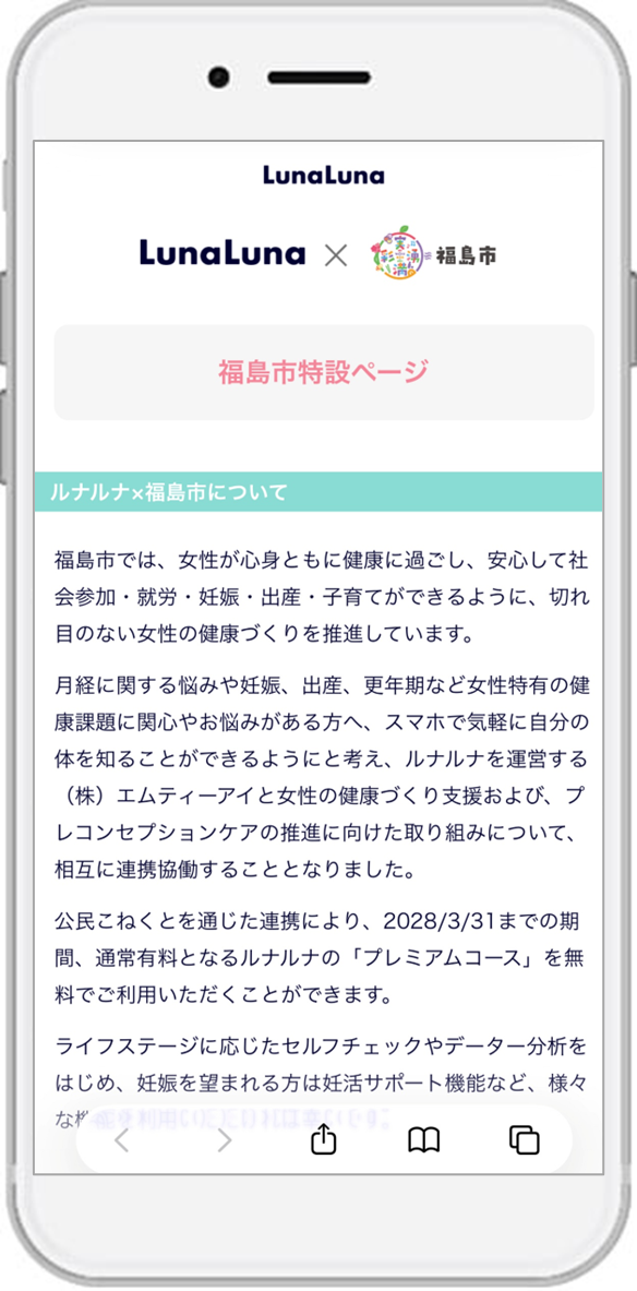本締結により、福島市の住民に対し、当社が提供する、すべての女性の一生に寄り添うウィメンズヘルスケアサービス『ルナルナ』の有料機能である「プレミアムコース」の無償提供を3月1日(日)より開始します。『ルナルナ』のサービスを通じて、不妊治療や妊活に関する基礎知識などの情報配信も予定しており、利用者はライフステージに合わせた健康情報を受け取ることができます。
