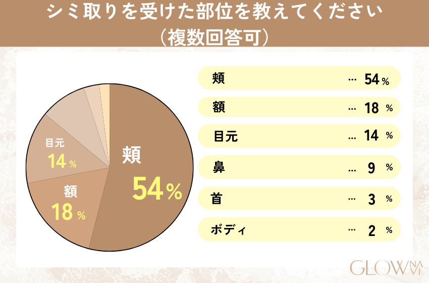 シミ取りを受けた部位は頬54%が最多で、額18%・目元14%が続く