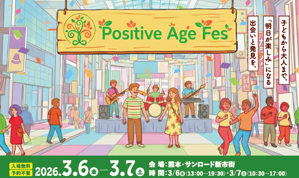 2026年3月6日(金)・7日(土)の2日間、熊本市中央区のサンロード新市街にて、年齢を重ねることを前向きに捉え、「明日が楽しみ(ポジティブエイジ)」と思える体験を提供するイベント「Positive Age Fes 2026」が開催されます。