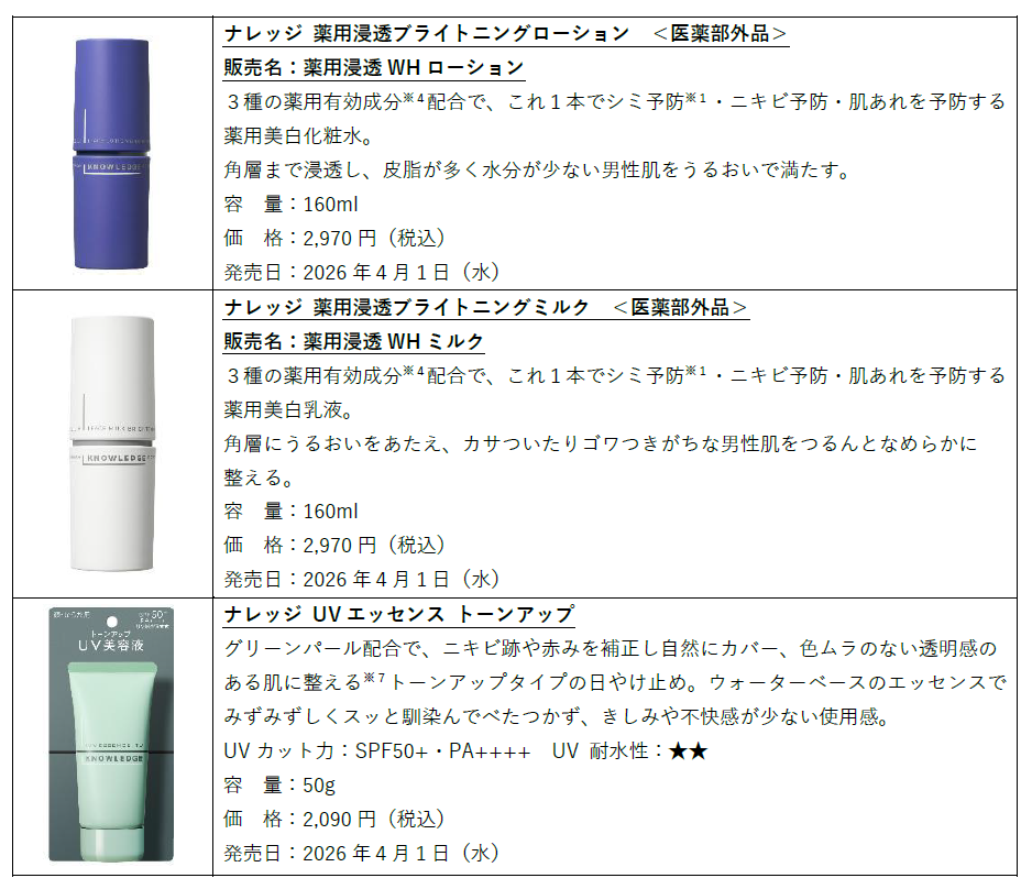 「未来の常識を創り出し、人々の生活を変えていく」をグループ理念に掲げ、日本全国47都道府県に3,600超の店舗、海外ではアジアを中心とする6エリアに98店舗(2025年12月末現在)のドラッグストア・調剤薬局を展開する株式会社マツキヨココカラ&カンパニー(本社:東京都文京区、代表取締役社長:松本清雄)は、メンズスキンケア・ヘアケアプライベートブランド「KNOWLEDGE(ナレッジ)」から新商品として、男性肌の浸透※2性にこだわった “セラミドバイセル※3”配合の「薬用浸透ブライトニングローション(医薬部外品)」、「薬用浸透ブライトニングミルク(医薬部外品)」と、トーンアップタイプの日やけ止め「UVエッセンストーンアップ」を4月1日(水)より全国のマツモトキヨシグループ、ココカラファイングループの店舗(一部店舗を除く)と自社オンラインストアで販売開始します。
