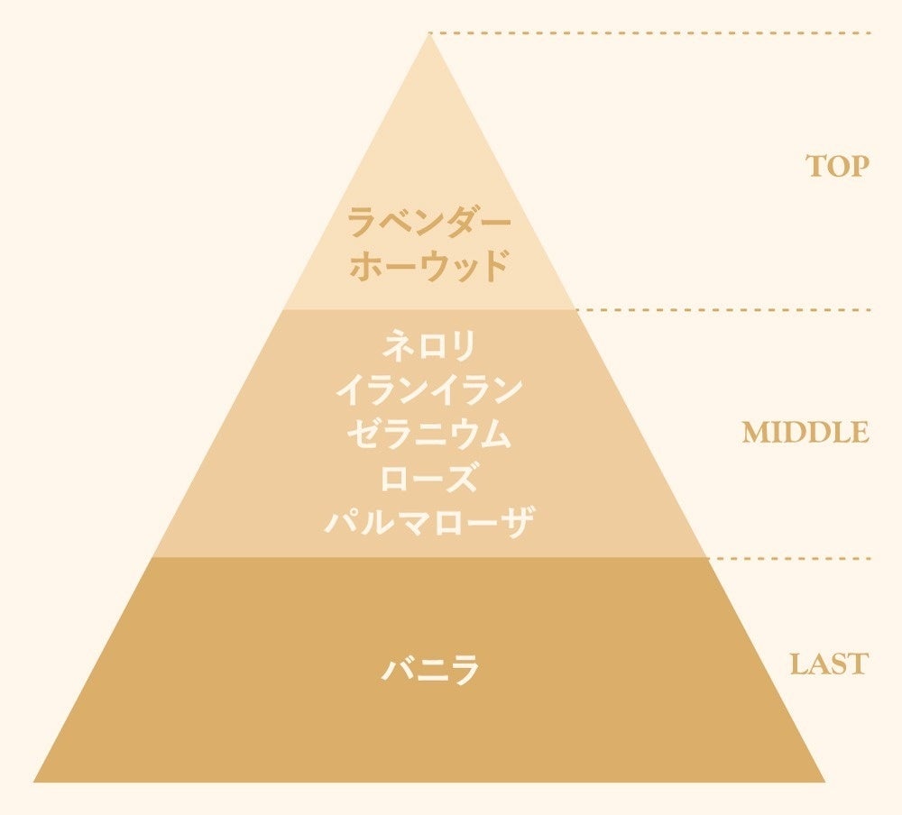 ミドルノート:ネロリ、イランイラン、ゼラニウム、ローズ、パルマローザ