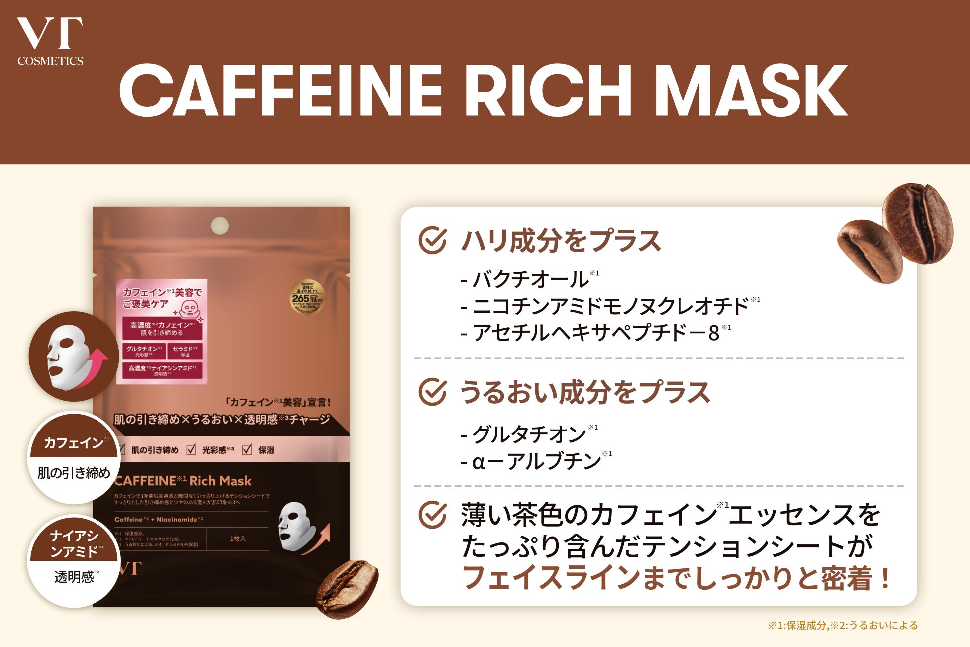 VTは常に新しいニーズに応えることのできる商品を追求し続けています。今回新しく登場する「カフェイン リッチマスク」は、ただ保湿するだけでなく、肌の引き締めも一緒にケアすることで、従来のケアでは満足できなかった方へ新しいスキンケア体験をお届いたします。VTはこれからも、使うたびに驚きと手応えを感じられる革新的※4な体験を提案してまいります。