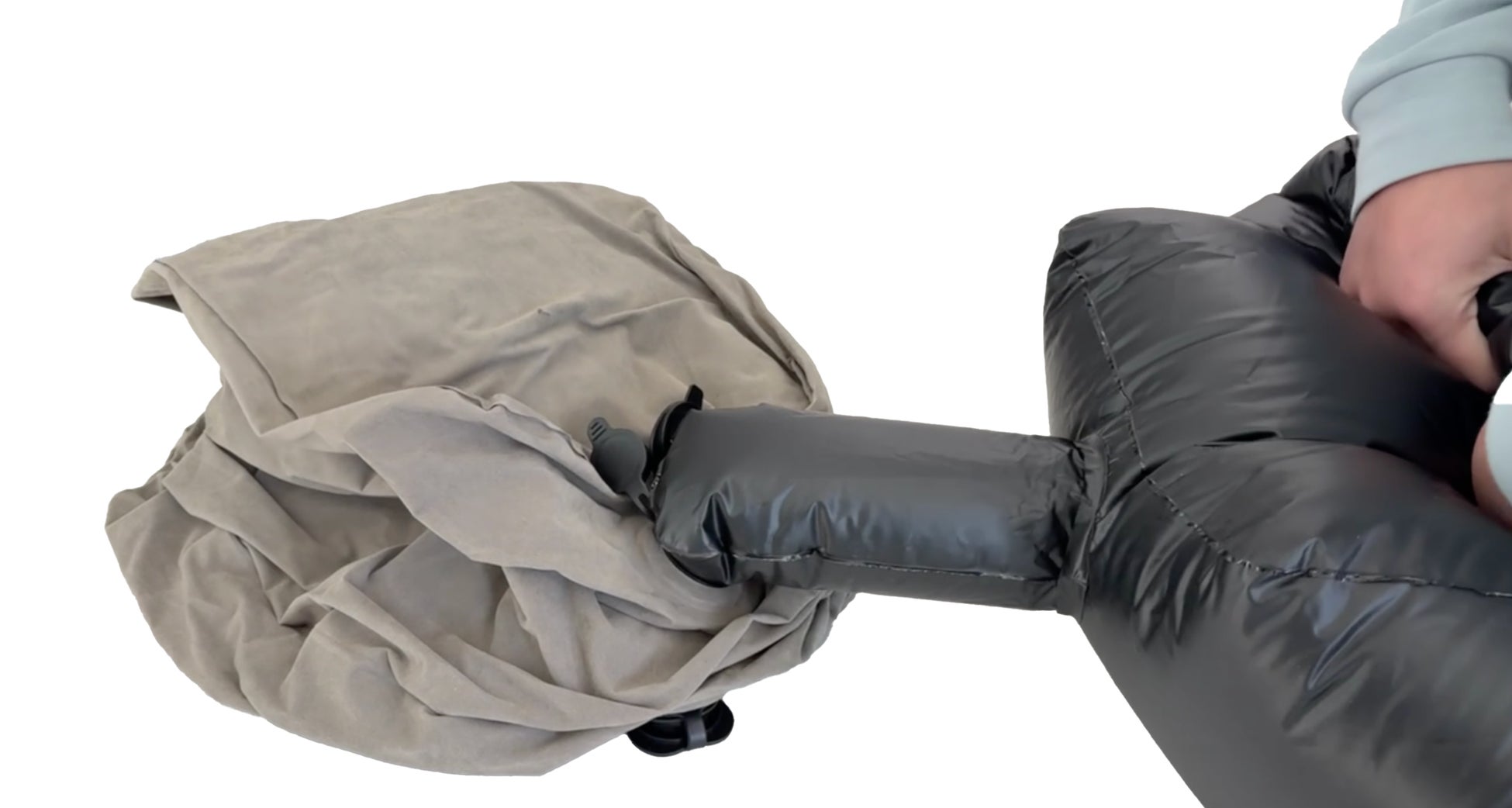 収納袋がポンプ代わりになる一体型構造を採用し、収納袋を広げて巻くだけのスマート設営方式です。口で膨らませる必要がなく、わずか30秒で完成します。ポンプ式と異なり空気を入れる音が静かなため、飛行機や夜行バスなどの静かな車内でも周囲を気にせず使用可能です。