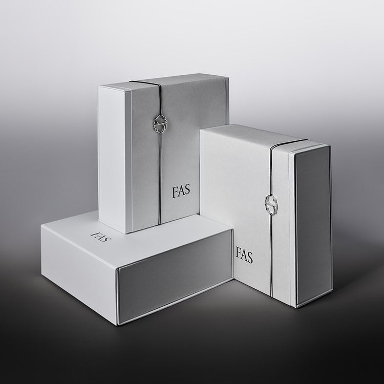 ギフトボックスには、熨斗とともに水引から着想を得たチャームをあしらいました。かつて、贈り物において「贈る側の想いを封じ込める」意味合いも含むと言われた水引をモチーフに、FASの思想を映し出す紋章をさりげなく添えたデザインとなっています。