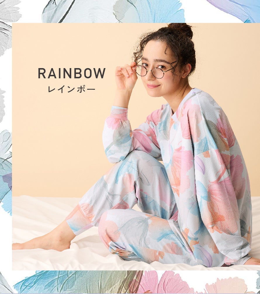 memorif.のアイコンフラワーであるチューリップと、心地よい眠りへの架け橋となる虹がモチーフ。リラックスタイムに彩りを。