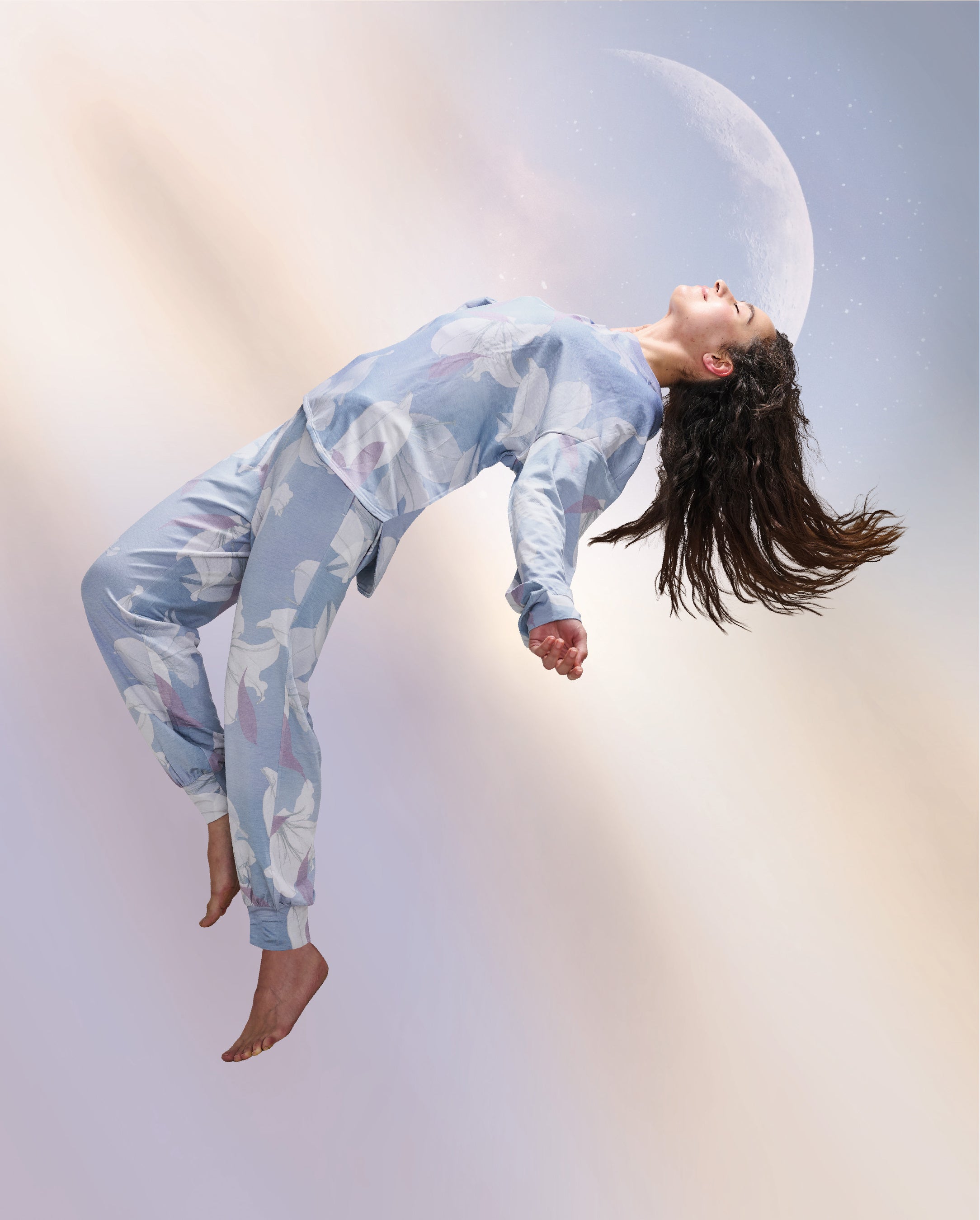 既視感のない新しさを感じながらも日常になじむ柄を作りたいという想いと、memorif.らしい透明感やグラデーションで上質な眠りへと誘いたいという想いを、いかにウェアへ落とし込むかが最大のポイントでした。