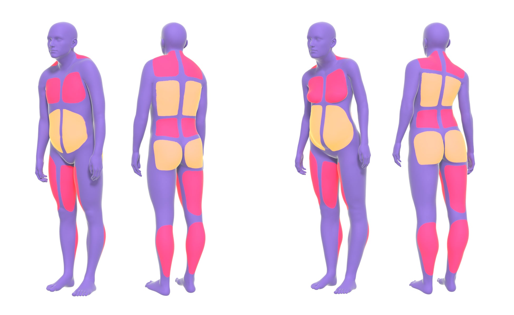 ※2:左が男性、右が女性の「左片あがり×反り腰猫背型姿勢」。ピンク色は筋肉が硬くなりやすい部位で、黄色は脂肪がつきやすい部位を表しています。