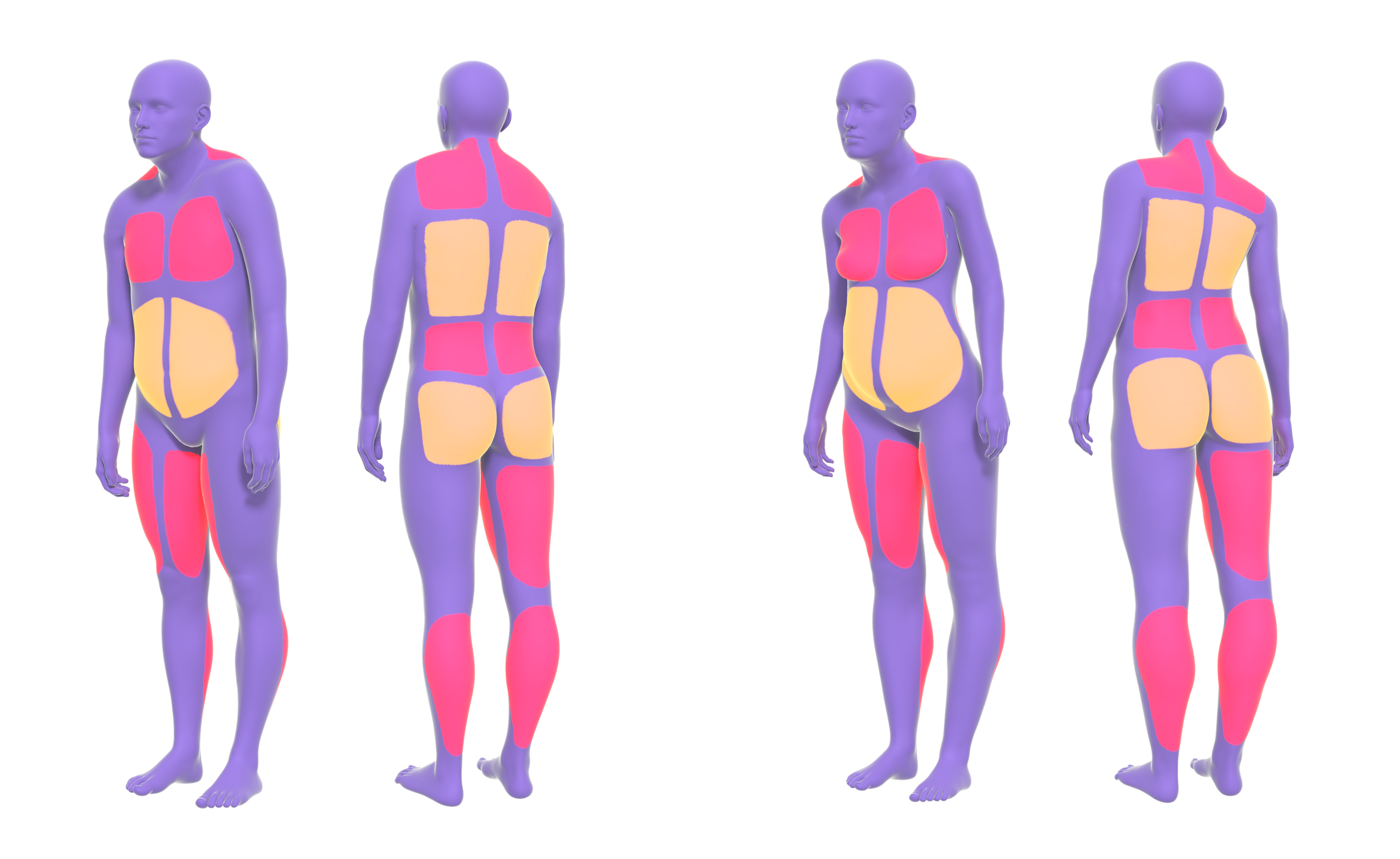 ※2:左が男性、右が女性の「左片あがり×反り腰猫背型姿勢」。ピンク色は筋肉が硬くなりやすい部位で、黄色は脂肪がつきやすい部位を表しています。