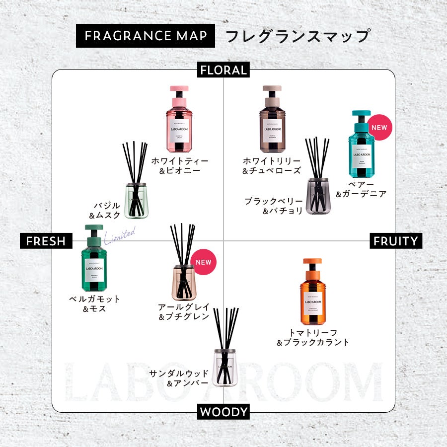株式会社bridge(本社:東京都港区北青山)はインテリアフレグランスブランドの“LABO AROOM(ラボアルーム)”から春の上質な空間を彩る2つの新香調を発売します。ルームフレグランスからはペアー&ガーデニアの香り、フレグランスディフューザーからはアールグレイ&プチグレンの香りを3月1日(日)より全国のドラッグストア(一部店舗を除く)、ECモール(Amazon、楽天市場)にて順次発売を開始します。