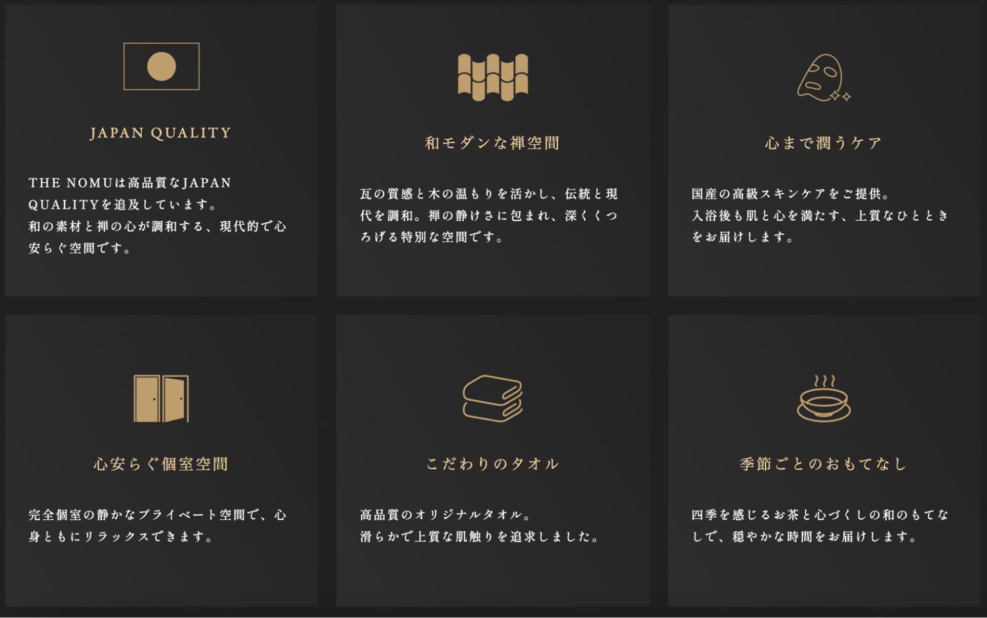 THE NOMUは、和と禅の精神を現代的に表現した空間の中で、完全個室による静かなプライベート時間を提供しています。国産高級スキンケアやオリジナルタオルなど、細部にまで品質へのこだわりを込めました。