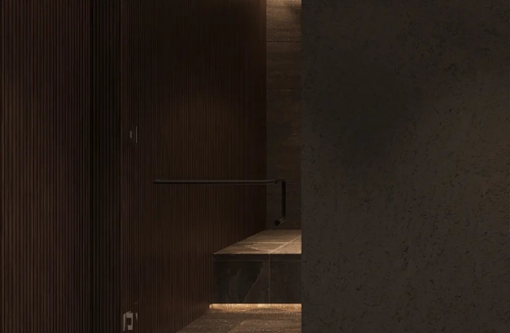 メディテーションで温まった身体を、やさしく鎮めるシャワールーム。石の質感と温かな光が、落ち着いた心地よさを生み出します。