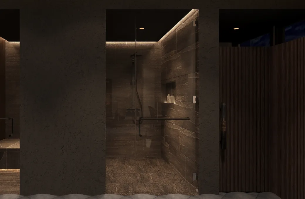 メディテーションで温まった身体を、やさしく鎮めるシャワールーム。石の質感と温かな光が、落ち着いた心地よさを生み出します。