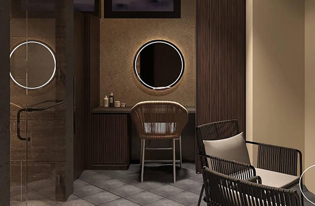 温かな灯りに包まれたパウダースペース。メディテーション後の静けさをそのままに、身支度を整えるひとときをお過ごしください。
