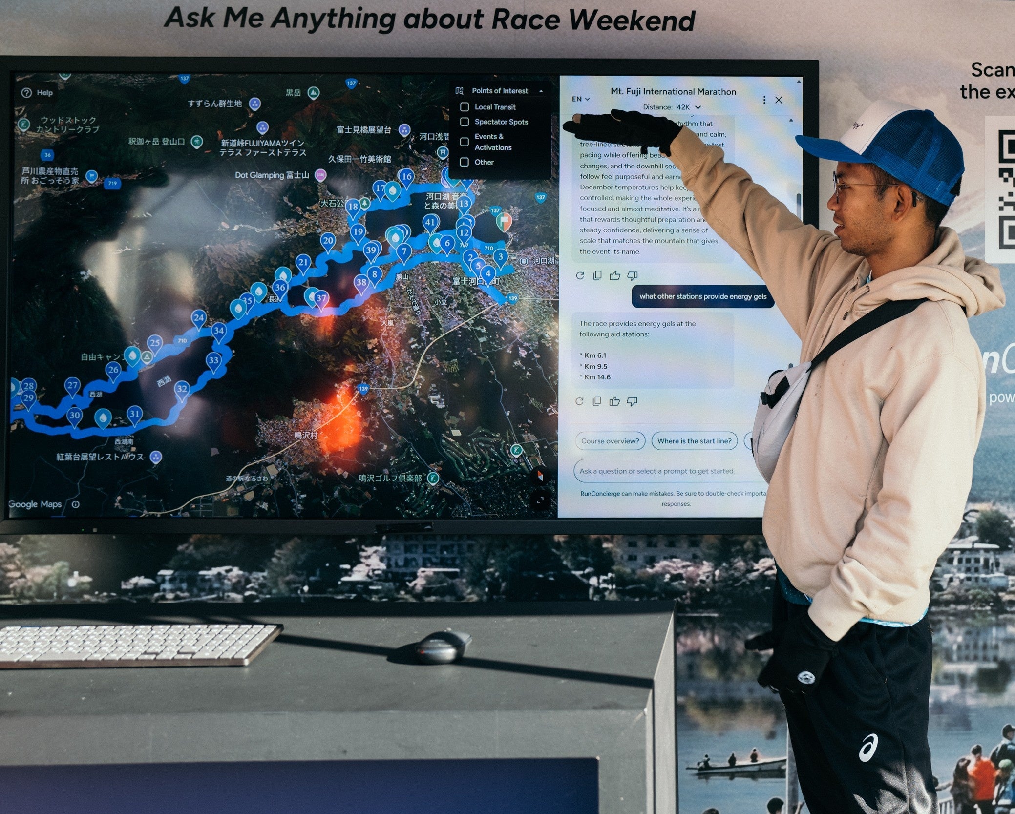 「RunConcierge」は、ユーザー個人の好みやニーズに基づいてカスタマイズされたコンテンツを提供すべく、Google MapsおよびGoogle Cloudの最新技術をはじめ、トレーニング、リカバリー、栄養、地元のニュースなどを扱うさまざまな企業と連携します。ランナーはチャット機能を通じてAIと対話することができ、これまで以上に簡単に、探している正確な情報を包括的に入手することができます。
