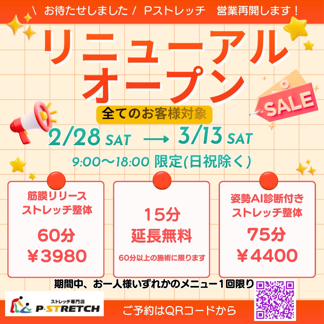 株式会社三福テンダーネス(本社:愛媛県松山市)は、松山市空港通りの「P・STRETCH(ピーストレッチ)空港通り店」にて、2026年2月28日(土)よりリニューアルオープンキャンペーンを実施します。期間は3月13日(金)までの限定開催です。