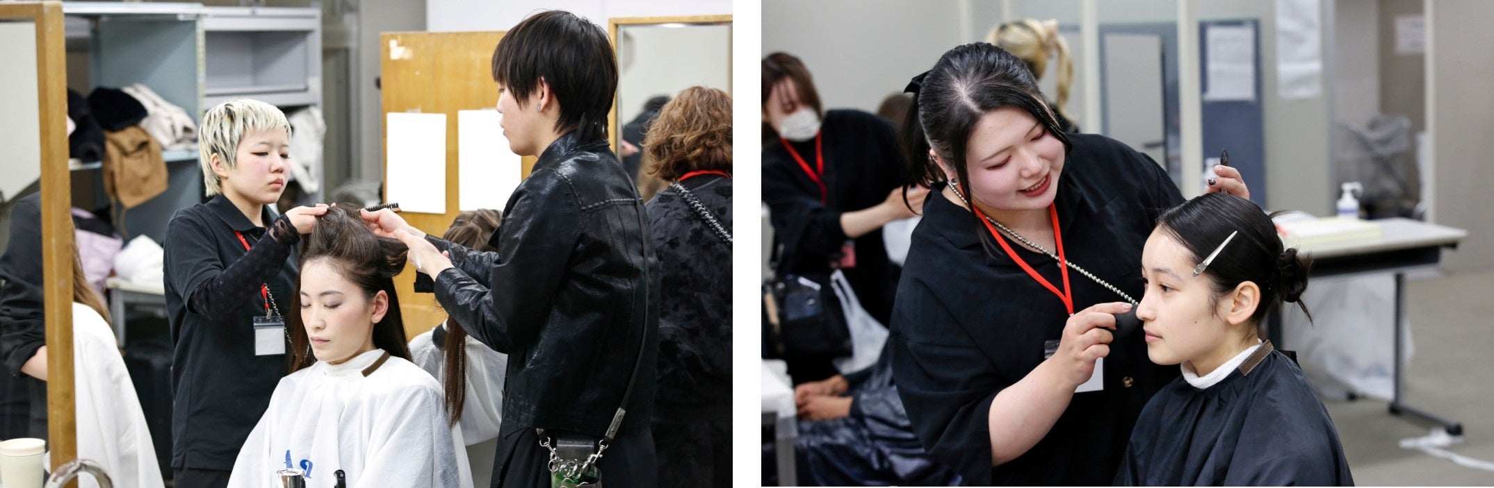 Ashは2014年の協働をきっかけに同大学との交流を深め、以降、継続的にヘアメイクを担当しています。院生が描く世界観を的確にくみ取り、ヘアデザインとして具体化することは、美容師にとって高度な技術力と提案力が問われる実践の場でもあります。双方が専門性を発揮しながら、一つのステージを創り上げる取り組みとなっています。
