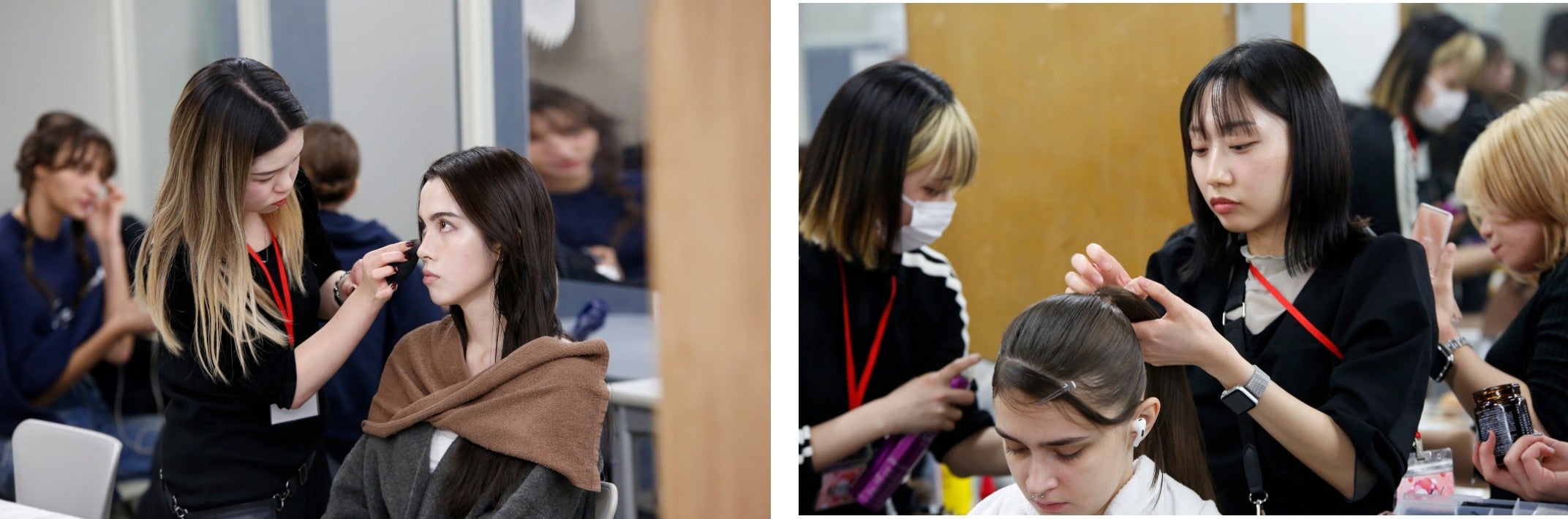 Ashは文化ファッション大学院大学(BFGU)との産学連携の一環として、ファッションショーのバックステージパートナーを継続的に務めています。各院生のコンセプトや世界観を共有しながら、ヘアメイクを通して作品の完成度を高める役割を担いました。ショー当日は、限られた時間の中で迅速かつ的確な対応が求められる緊張感ある現場となりましたが、チーム一丸となってステージを支えました。