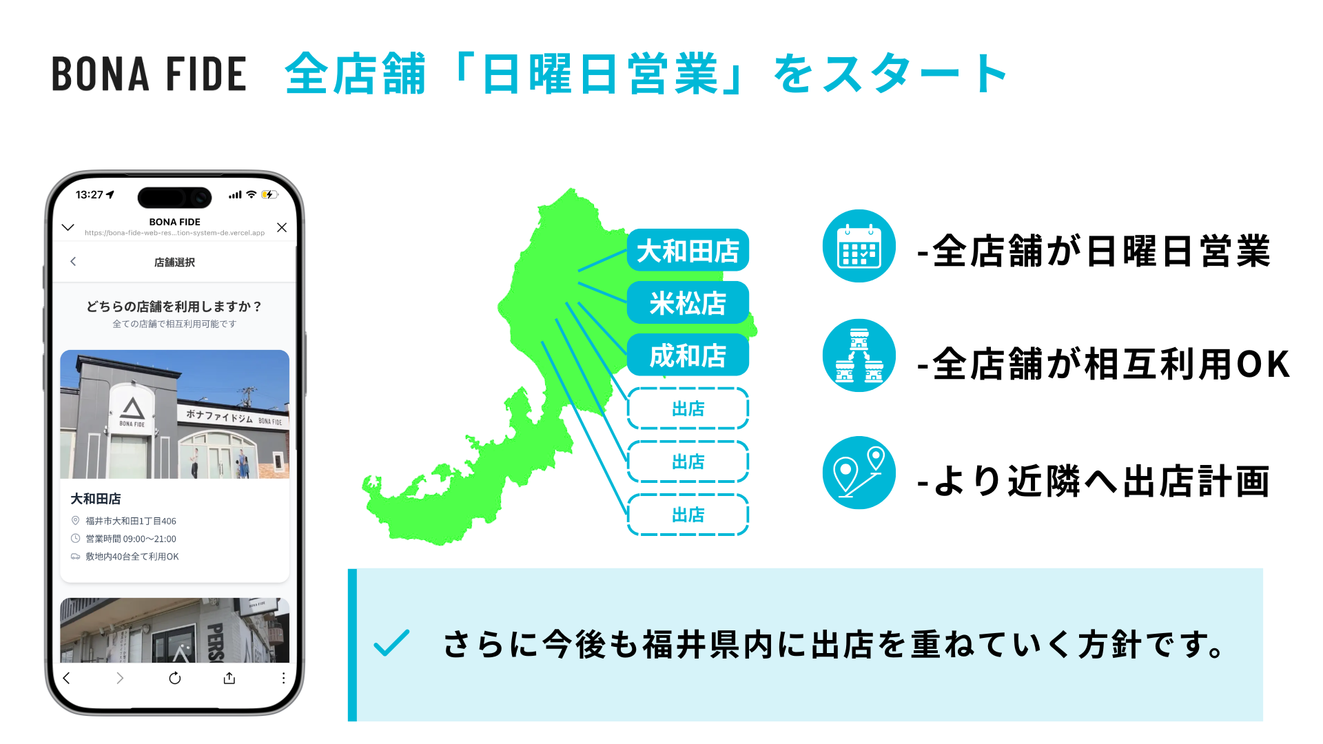 株式会社BONA FIDE(本社:福井県福井市、代表取締役:上田涼太)は、2026年3月から5月にかけてボナファイドジム3店舗で「段階的アップデート計画」を実行いたします。