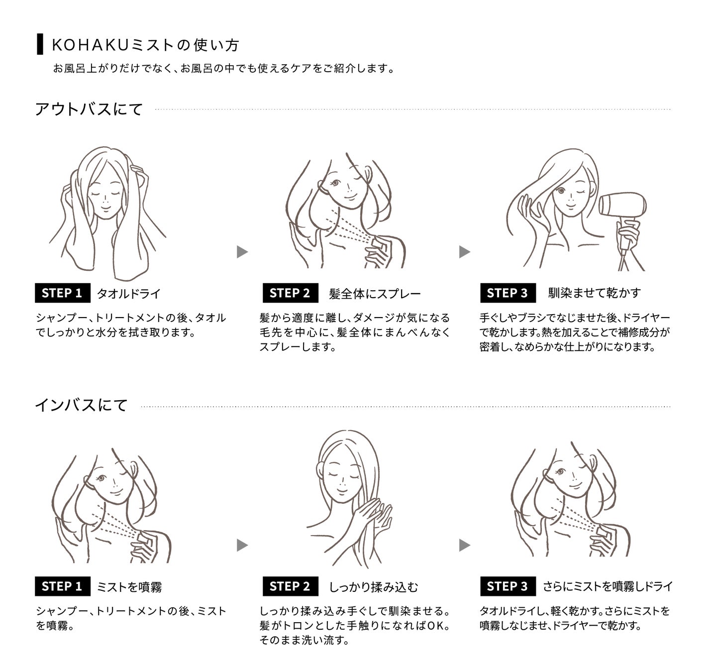 ①ドライヤーの熱を利用して髪に密着し、内部まで浸透・補修してうねりや広がりを抑える
