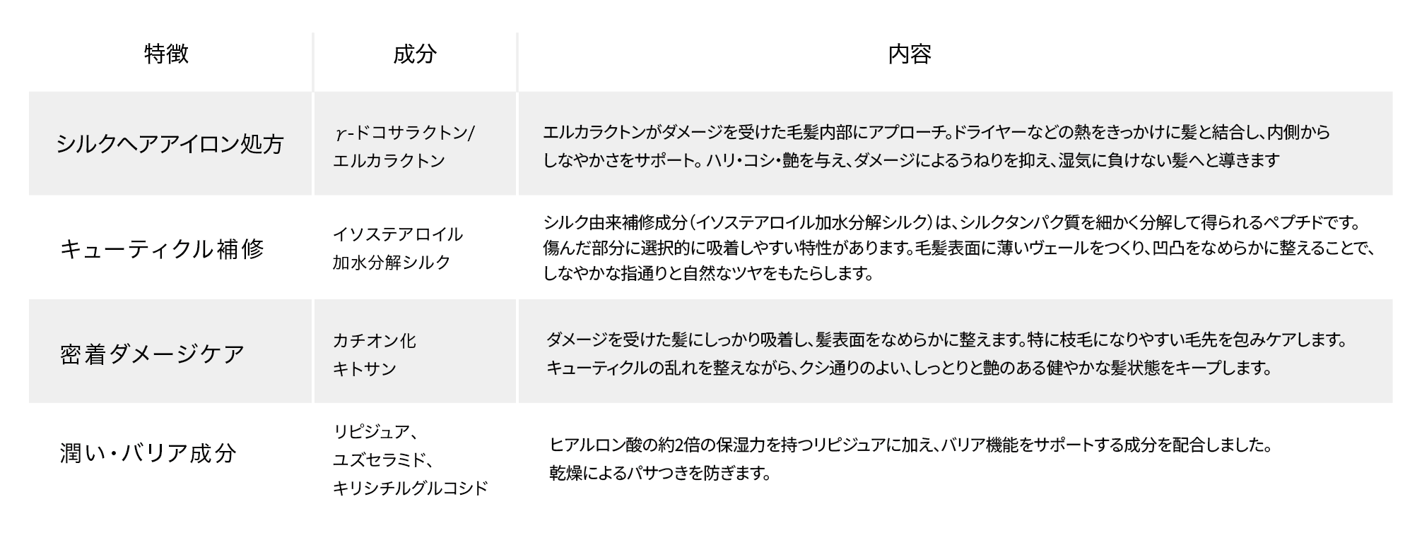 これらの特徴により、毎日のドライヤーの熱から髪を守りながら、触れるたびに心が満たされる確かな手触りと、まとまりのある美しい髪へと導きます。