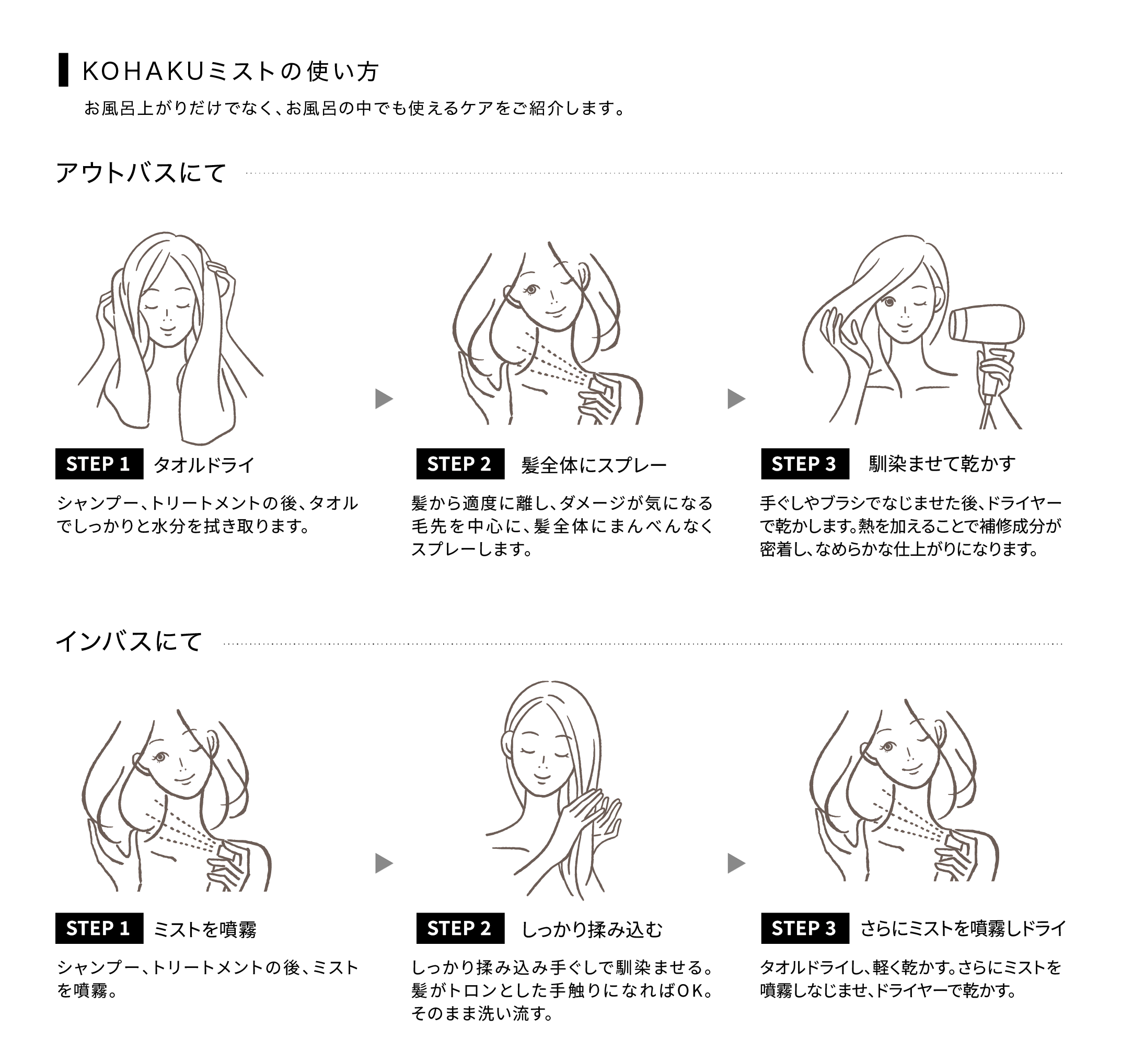 ①ドライヤーの熱を利用して髪に密着し、内部まで浸透・補修してうねりや広がりを抑える