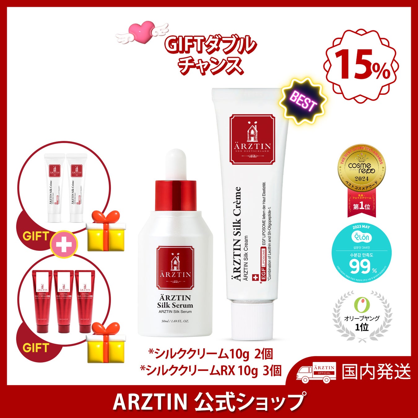 今回のメガ割イベントセット構成の商品以外にもエルツティンの『シルククリームRX 10G』単品の商品もプレゼントする。プレゼントたくさんもらえるイベントを行う。エルツティンのシルクセラムは弾力効果がありEGFリポソームと3GFコンプレックス配合で早くお肌の弾力を回復させる。17種類の肌アミノ酸と3重発酵エキス30,000ppm配合で 肌に深い保湿を提供し、乾燥を防ぎ、肌をしっとりと保ちますので高保湿光彩効果がある。他には 肌バリアの強化、 敏感肌にも使用可能、ブライトニング効果の様々な性能でシルクセラムを感じてください。