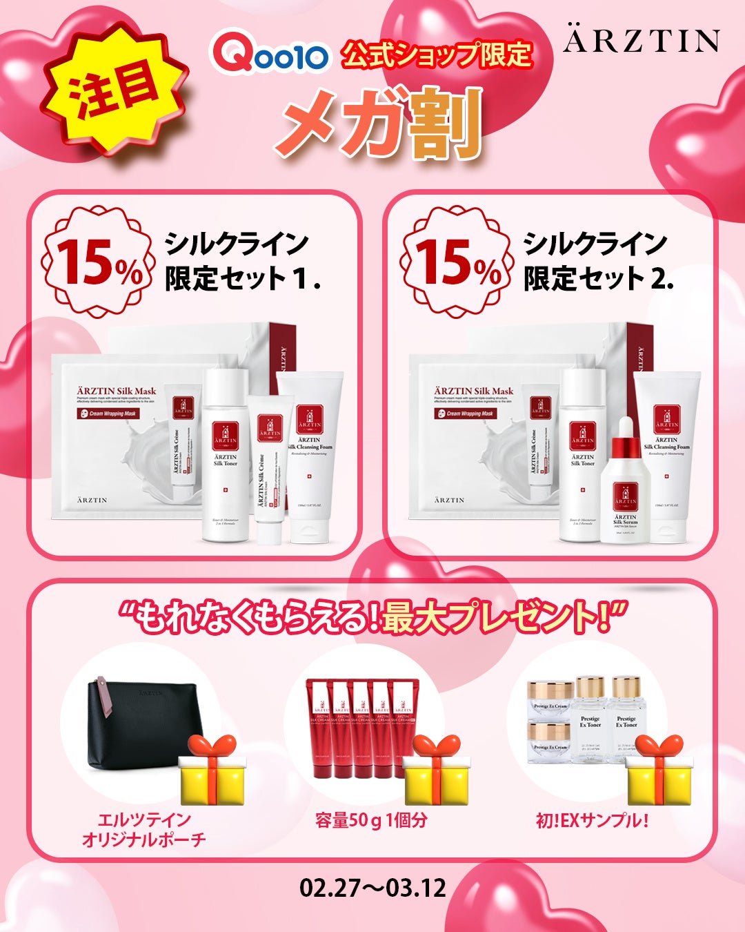 今回のエルツティンQoo10公式ショップのメガ割では、最大70%OFFとお買い上げの方全員にはARZTINサンプル3種1個セットを3個(合計9個)をプレゼントとS2NDの「ニュープラネットティント(色はランダム) 1個」、10,000円以上は「シルククリーム(30ML)5,800円相当1個」をプレゼント。 以前よりお得なクーポンも700円クーポン、300円クーポン、500円クーポン、200円クーポン、100円クーポン様々なクーポンを発行して10,000円以上は送料が無料のチャンスがありますのでぜひ、楽しんで下さい。
