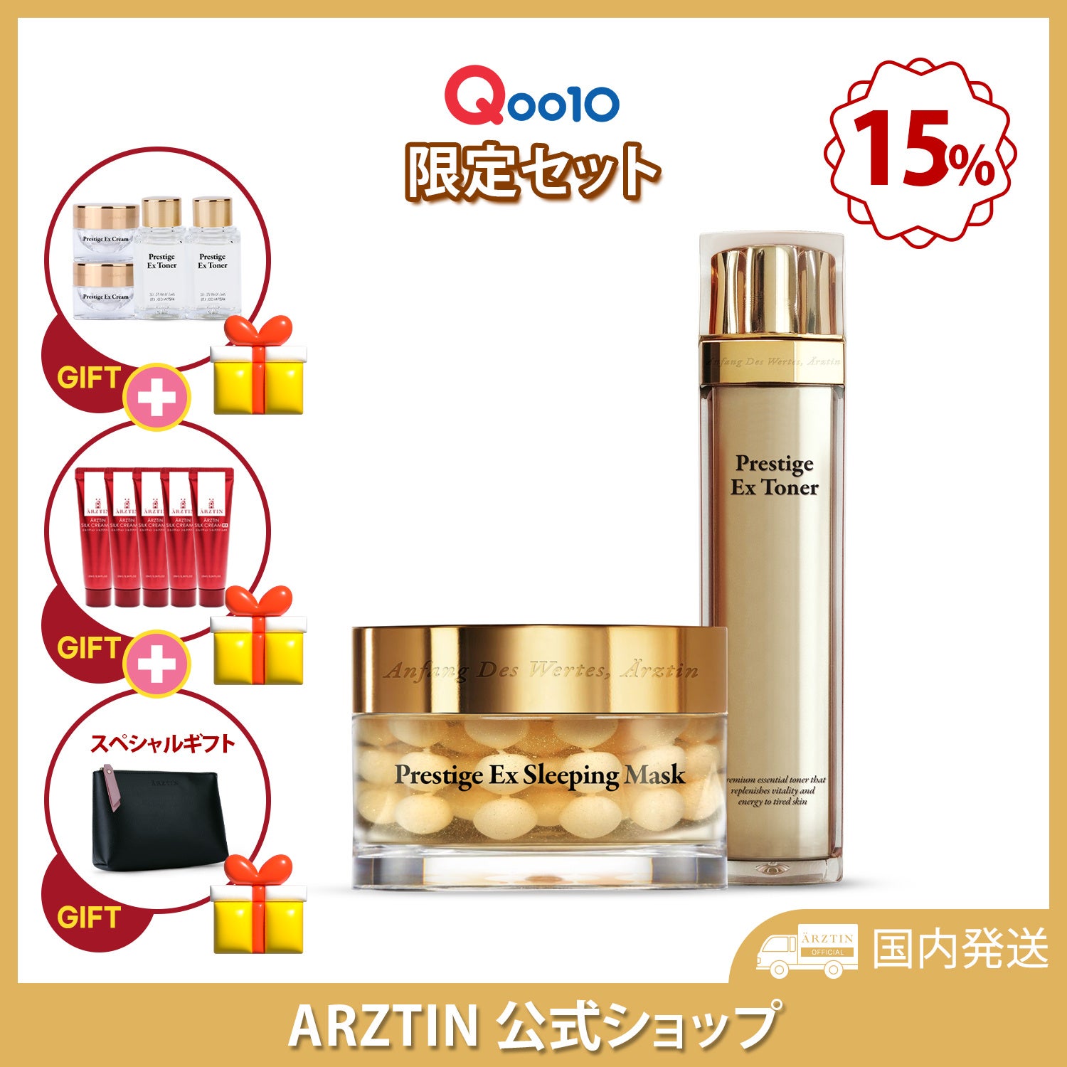 『「メガ限定セット」プレステージEXトナー&EXスリーピングマスク+シルククリームRX10 g5個+プレステージEXトナー20ML2個+プレステージEXクリームミニチュア2個+エルツテインオリジナルポーチ1個』