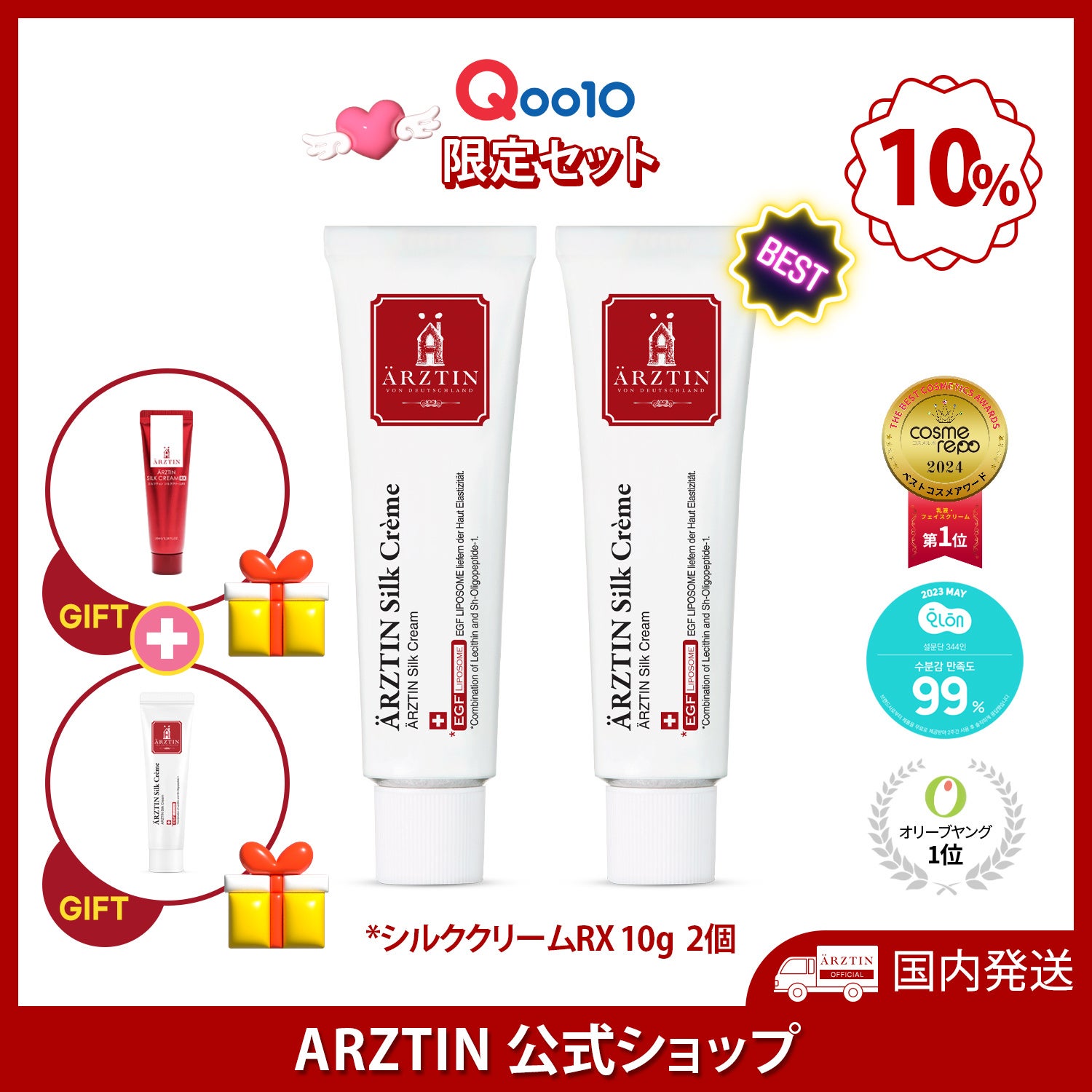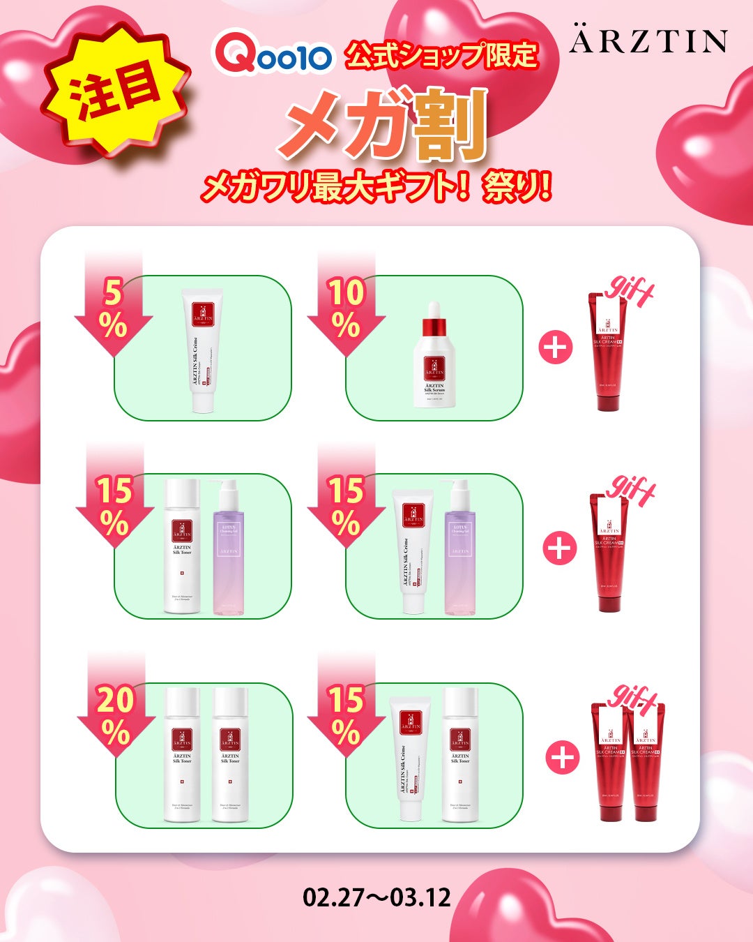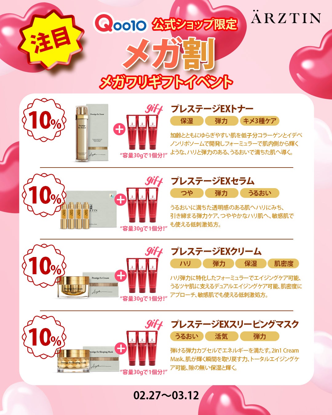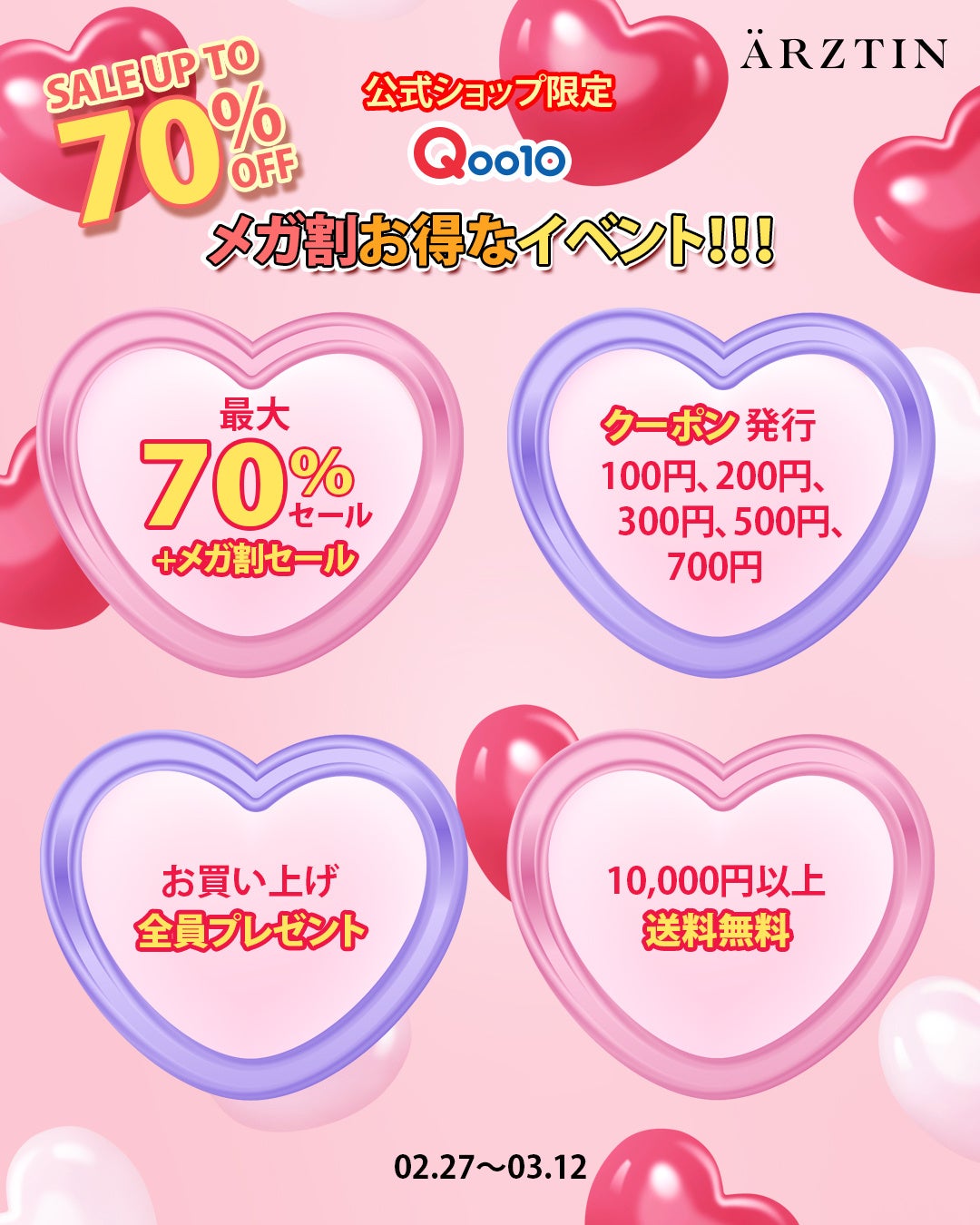 今回のエルツティンQoo10公式ショップのメガ割では、最大70%OFFとお買い上げの方全員にはARZTINサンプル3種1個セットを3個(合計9個)をプレゼントとS2NDの「ニュープラネットティント(色はランダム) 1個」、10,000円以上は「シルククリーム(30ML)5,800円相当1個」をプレゼント。 以前よりお得なクーポンも700円クーポン、300円クーポン、500円クーポン、200円クーポン、100円クーポン様々なクーポンを発行して10,000円以上は送料が無料のチャンスがありますのでぜひ、楽しんで下さい。