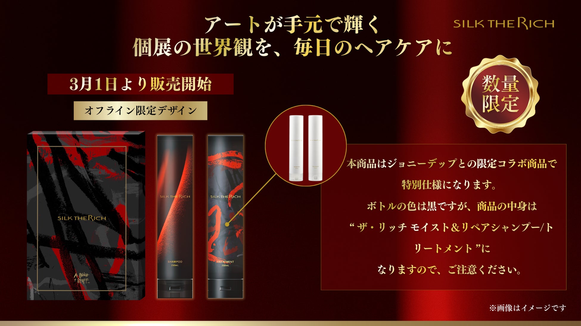 〜「いいなっ」の瞬間を創ろう。〜をビジョンに掲げ、シルクの魅力を発信する製品「SILK THE RICH」の販売を行う株式会社THE RICH(本社:東京都渋谷区、代表取締役社長兼CEO/founder 三浦裕太)は、ジョニー・デップ氏とのコラボレーションにおいて、オフライン店舗限定の特別デザインボトル(シャンプー&トリートメントセット)を2026年3月1日(日)より順次発売いたします。