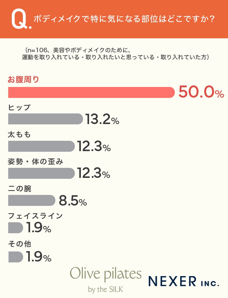 最も多かったのは「お腹周り」で50.0%でした。次いで「ヒップ」が13.2%、「太もも」と「姿勢・体の歪み」が同率12.3%で並びました。「二の腕」は8.5%、「フェイスライン」は1.9%です。