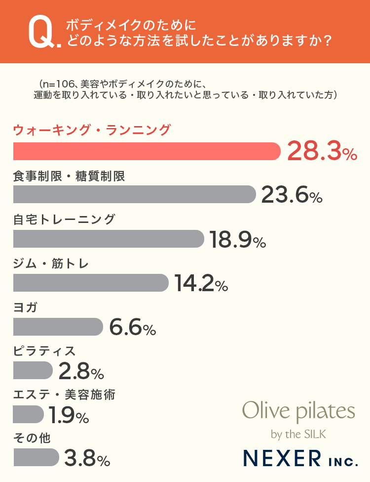 1位は「ウォーキング・ランニング」で28.3%、2位は「食事制限・糖質制限」で23.6%、3位は「自宅トレーニング」で18.9%でした。「ジム・筋トレ」は14.2%、「ヨガ」は6.6%、「ピラティス」は2.8%、「エステ・美容施術」は1.9%です。